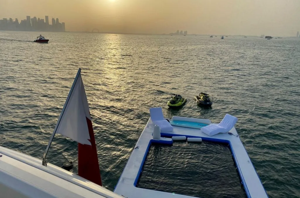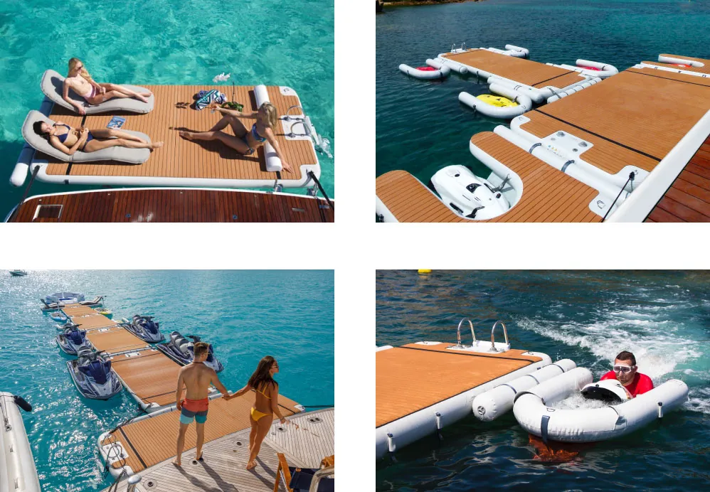 Inflatable docks are pumped up and then attached to the stern while at anchor. These provide extra space for swimmers and sun-bathers. Some of these designs can even accommodate personal watercraft for storage or quick access.