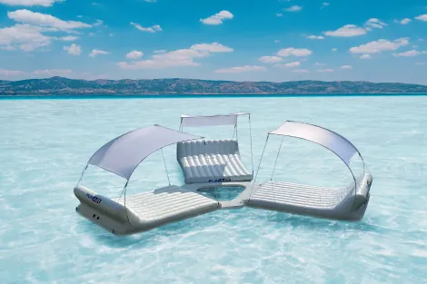 A range of functionality has created an explosion of new inflatable shapes, like platforms with a cabana and tent structures to keep guests cool and out of the sun. Several varieties also include inflatable chair and sofa designs.