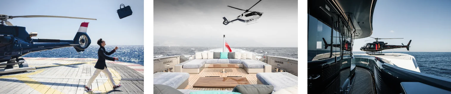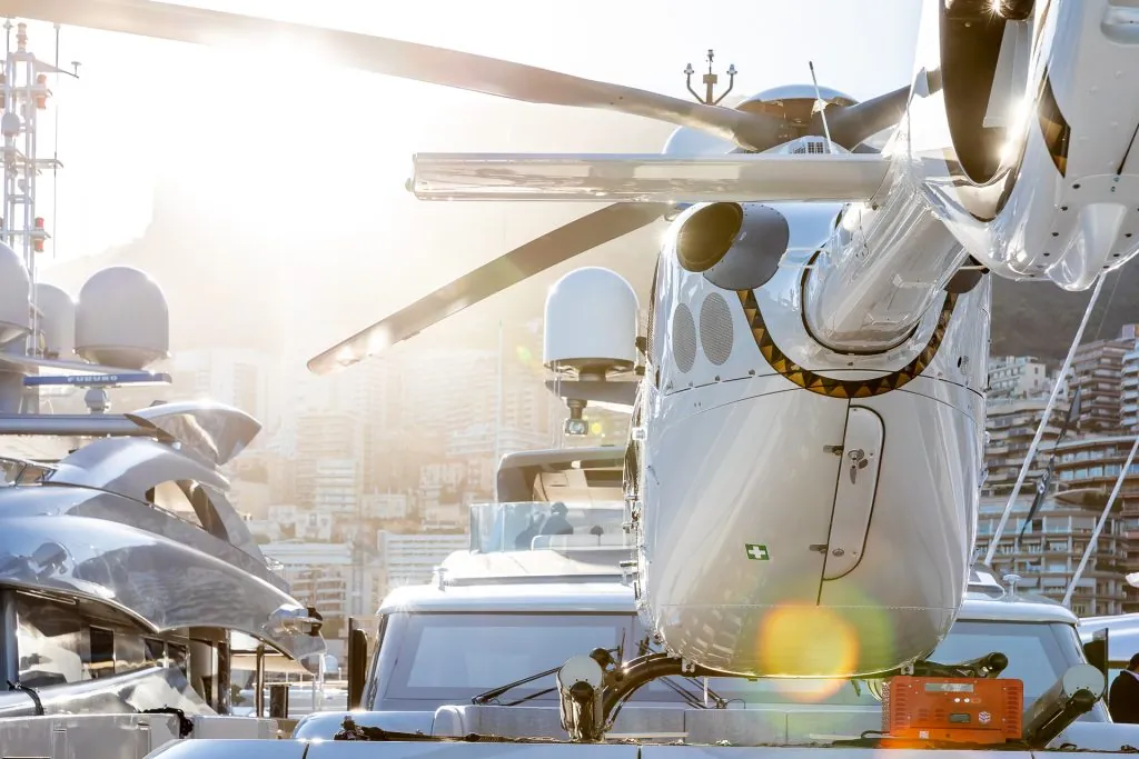 The maximum size of the helicopter depends on the size of the yacht because a helipad takes up significant space. A helipad should be 1.25 times longer than the helicopter’s tail rotor. Typically, this is at least 40′ x 40′, and should include a surrounding safety zone that is at least 82′ x 82′. Helicopters can range from small two-seaters to large helicopters that can transport four to eight passengers. (Don’t forget to allow room for luggage when deciding how many passengers you can fly.)