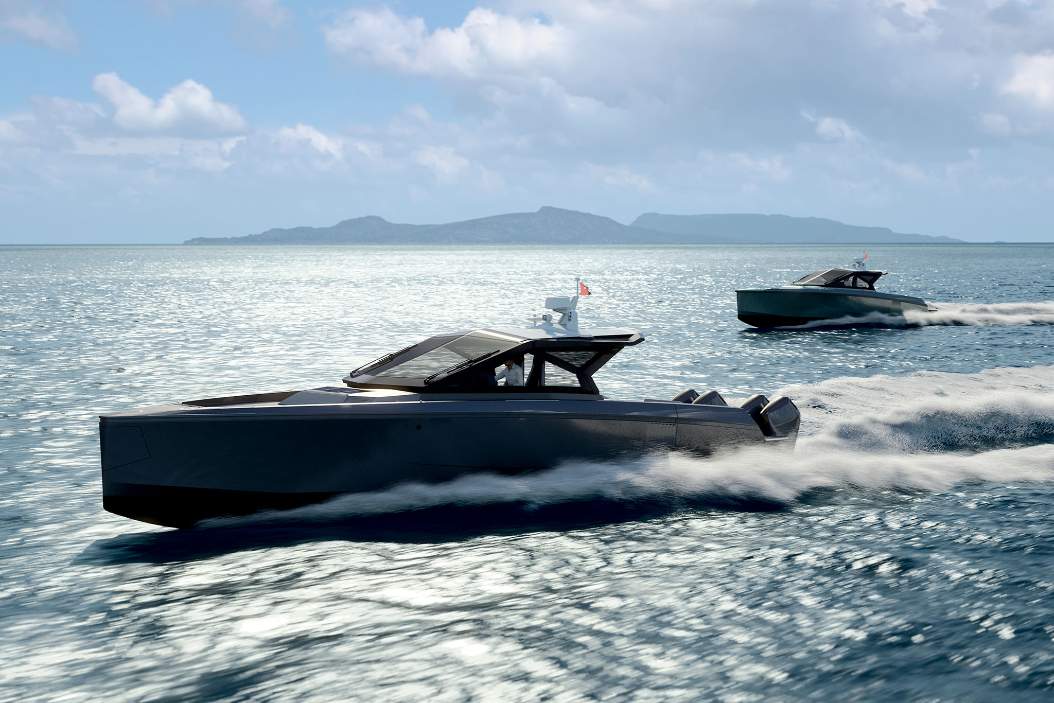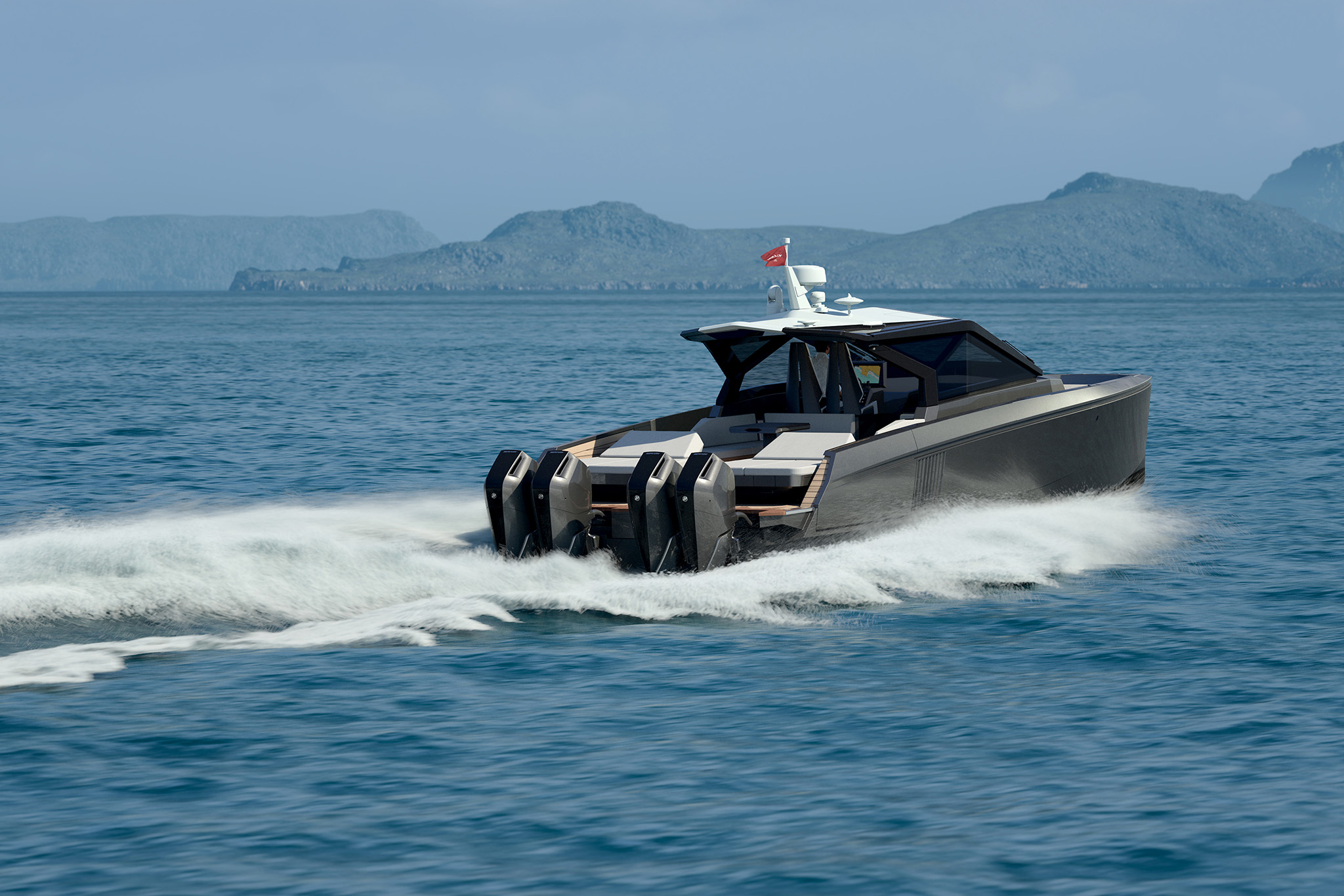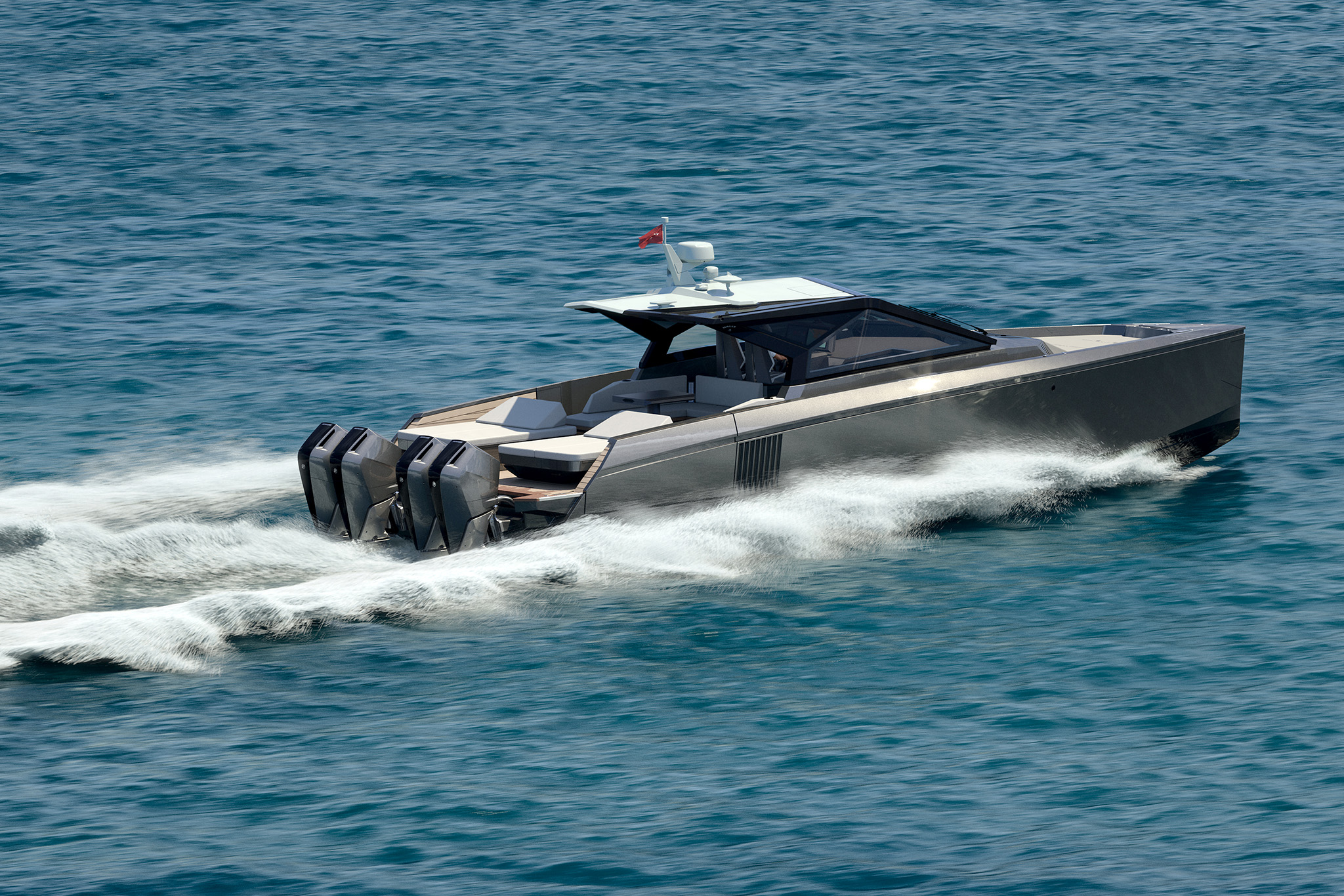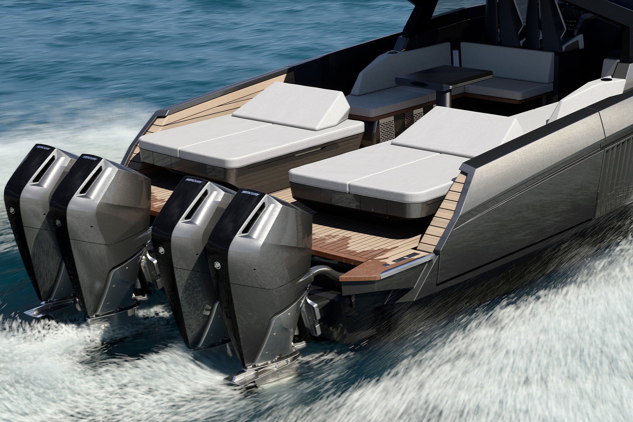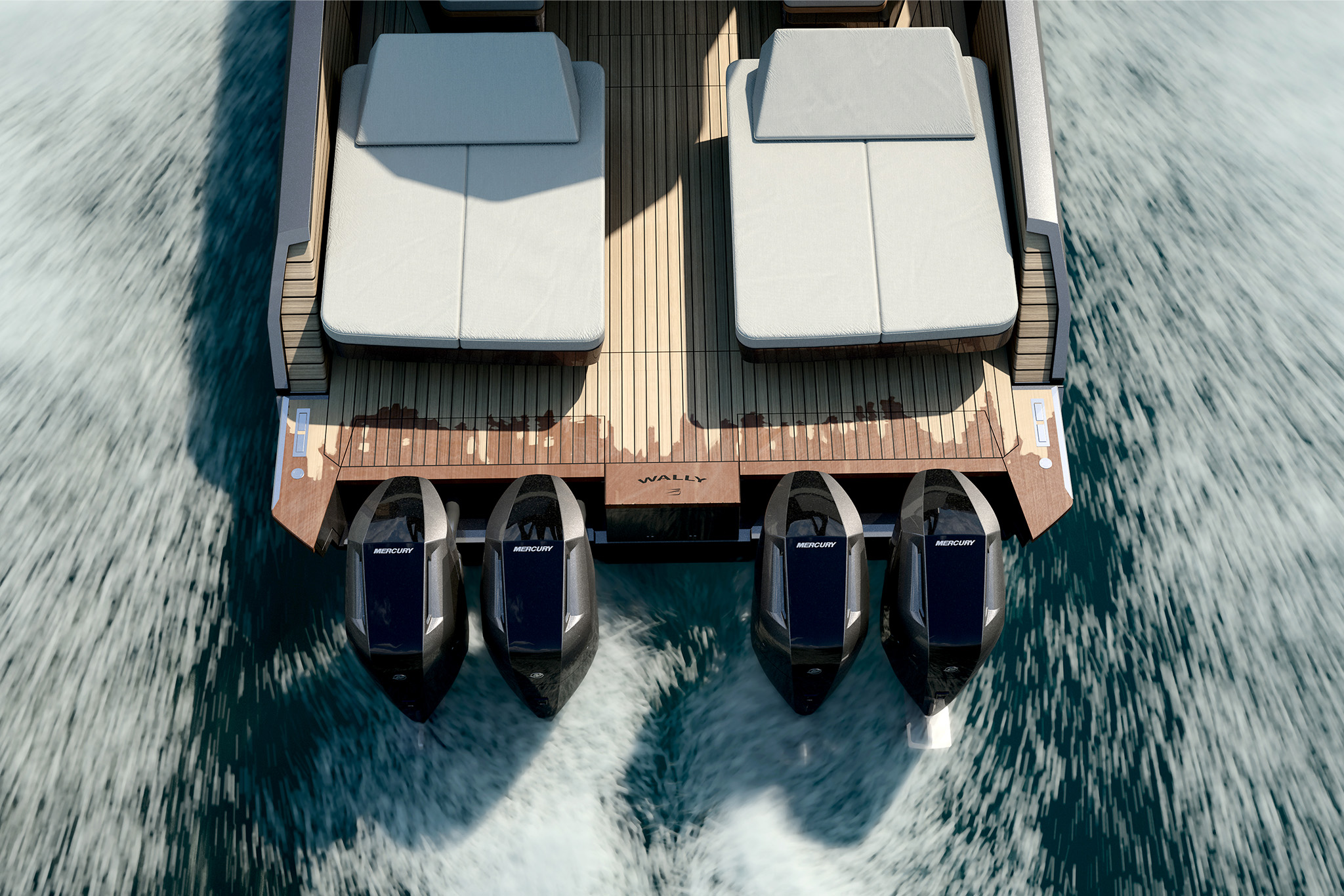 All Wally’s ‘X’ models are optimised for outboard propulsion, with a notch on the transom that can take four Mercury Racing outboards rated up to 500hp each. With this ultimate power package, expect thrilling speeds over 50 knots and an empowering range of 180 miles. Dial it back a fraction to 4 x 400hp engines, and you can still look forward to 48 knots and a range of 240 miles.