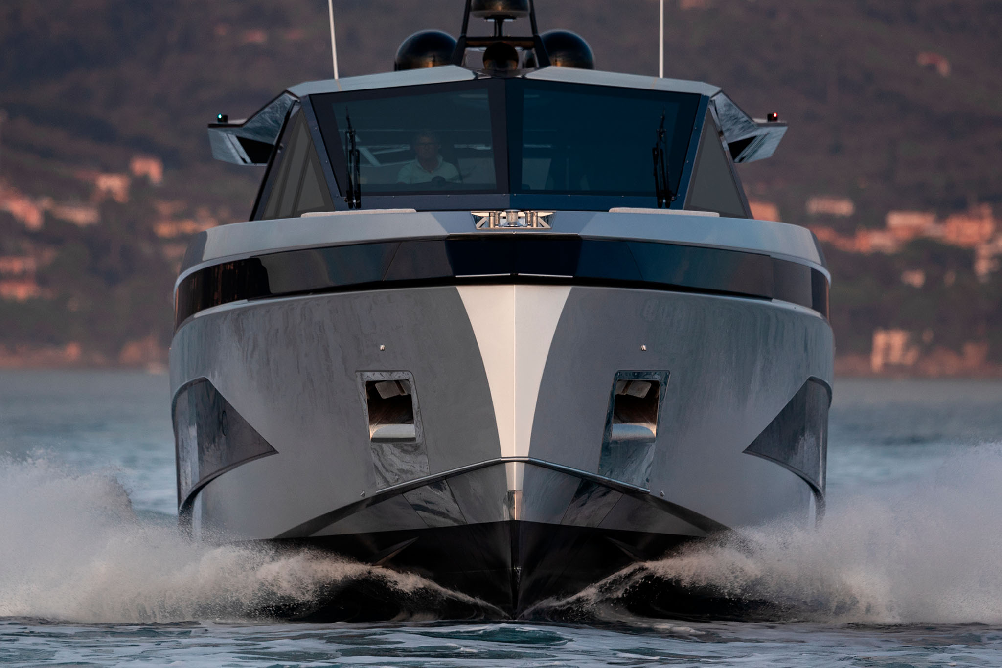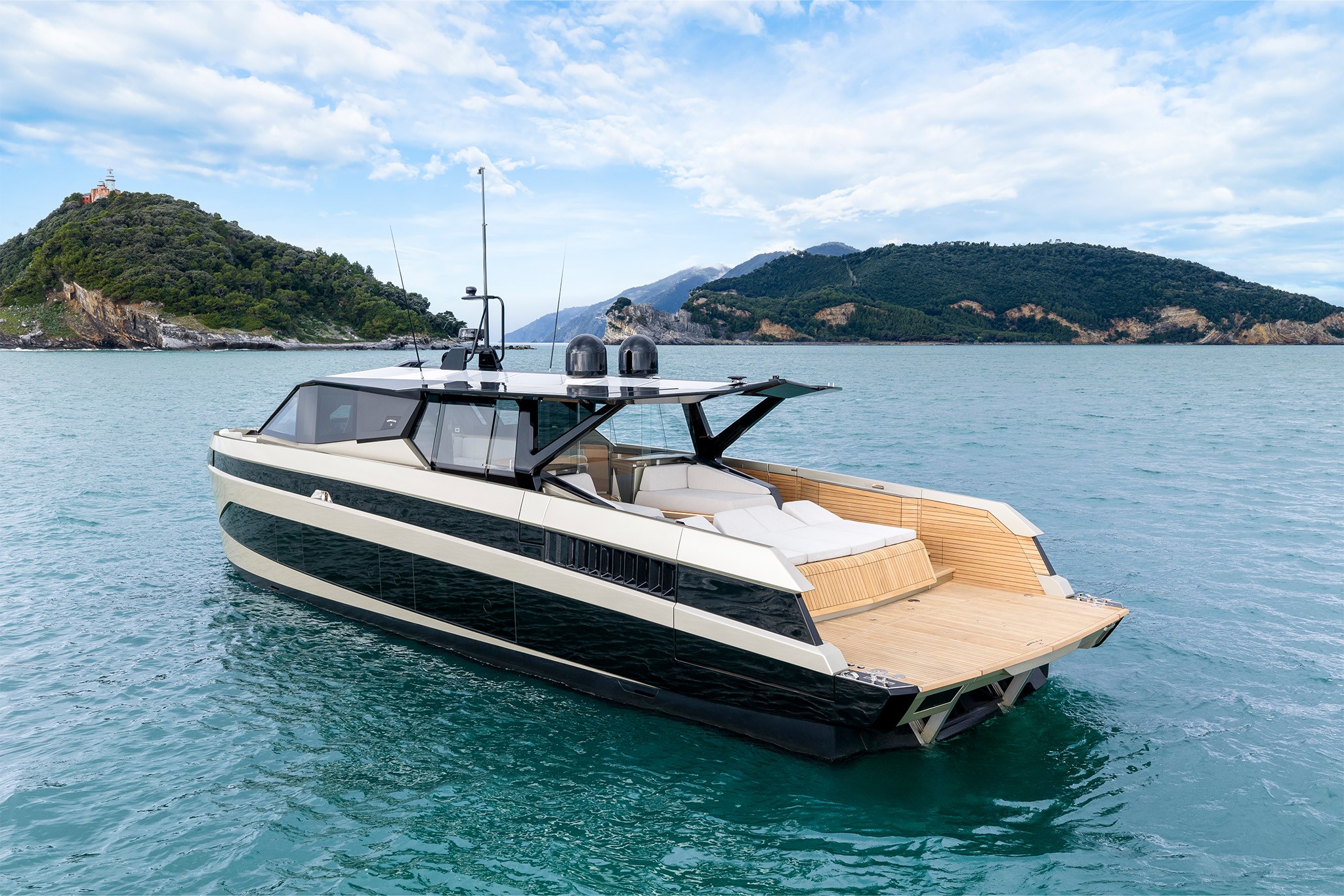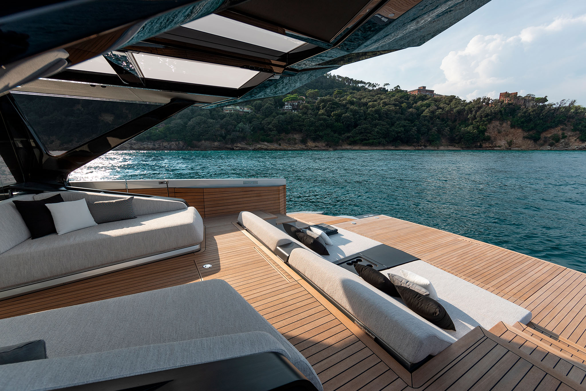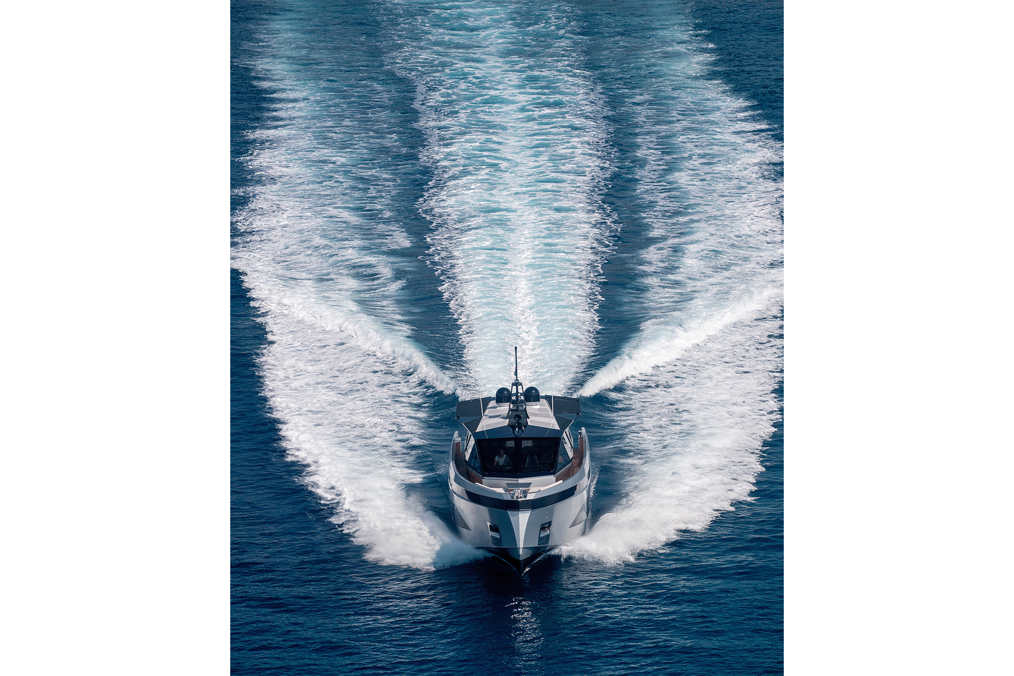 A close relationship with the water is as much part of Wally’s DNA as excellent performance, so naturally the boat has a huge beach area with fold-down wings. The hydraulic passerelle doubles as swim steps, while the whole rear platform lowers to launch or retrieve tenders and toys. And you can revel in the seascape over an aperitivo from the comfort of the forward cockpit.
