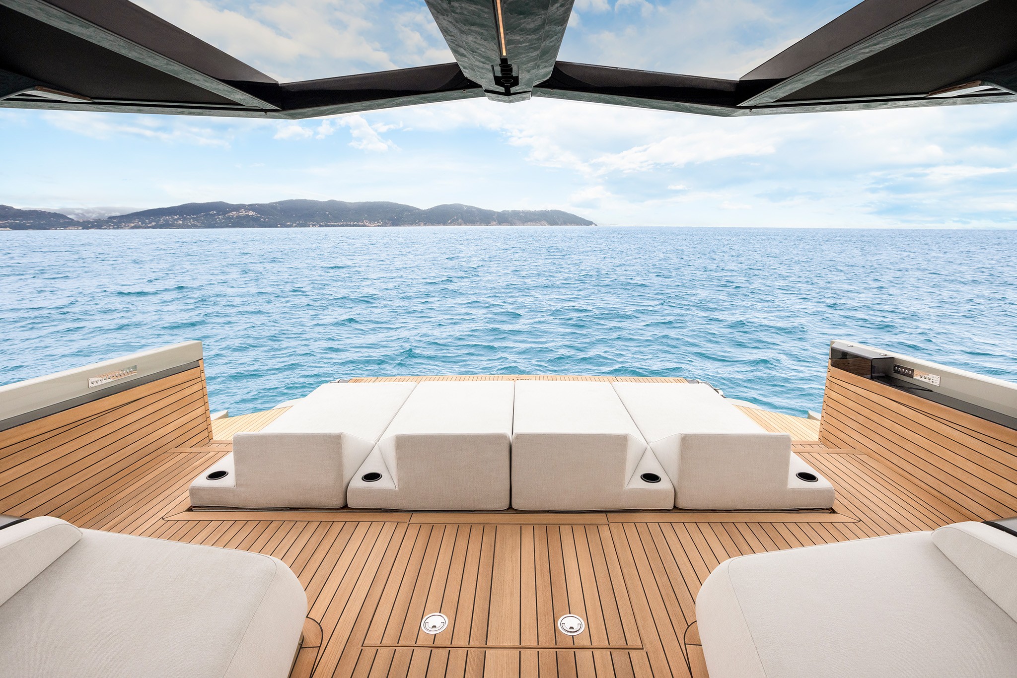 At its core is a single flush deck running from bow to stern. Chameleon-like, it adapts stylishly to different occasions thanks to a hybrid inside-outside concept. There’s dining for six, two chaises-longs, a bar and a galley, where the interplay between opening sides and aft doors can completely alter the ambiance. The wheelhouse can be easily closed off and the cockpit turned into a cosy movie lounge.