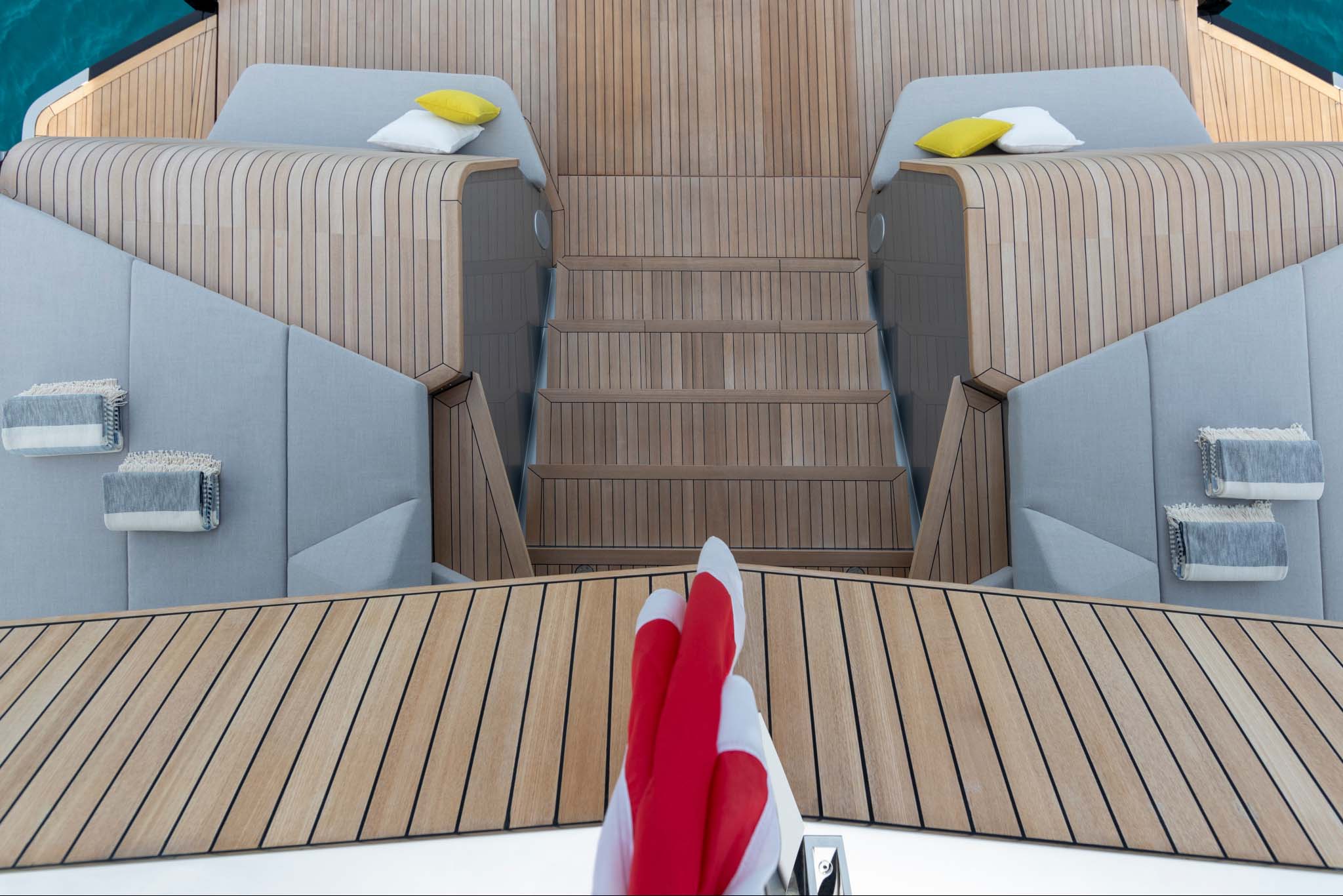 The design is breathtaking, with elegant teak decking and steps that cascade down to the beach club aft, which extends with wings at the side and a hydraulic bathing platform that doubles as a passerelle. A 4.15m tender and other toys are garaged invisibly behind the wings.