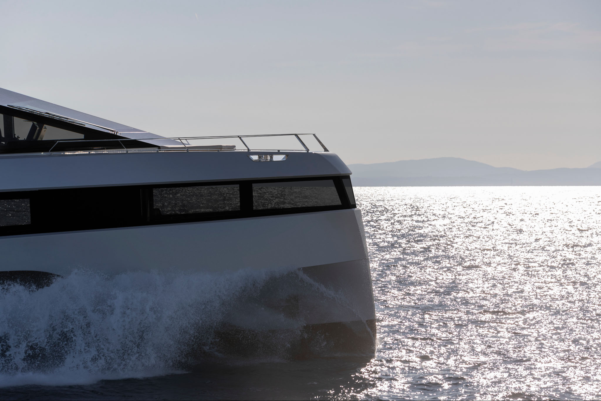 With its full-wide body, the signature of this futuristic space ship is the vast owner’s suite in the bow, which seems to hang over the water below. Wally has expertly engineered a strip of tall glass running all the way round the main deck, providing the cabin with a 270-degree panoramic views and astonishing natural light.