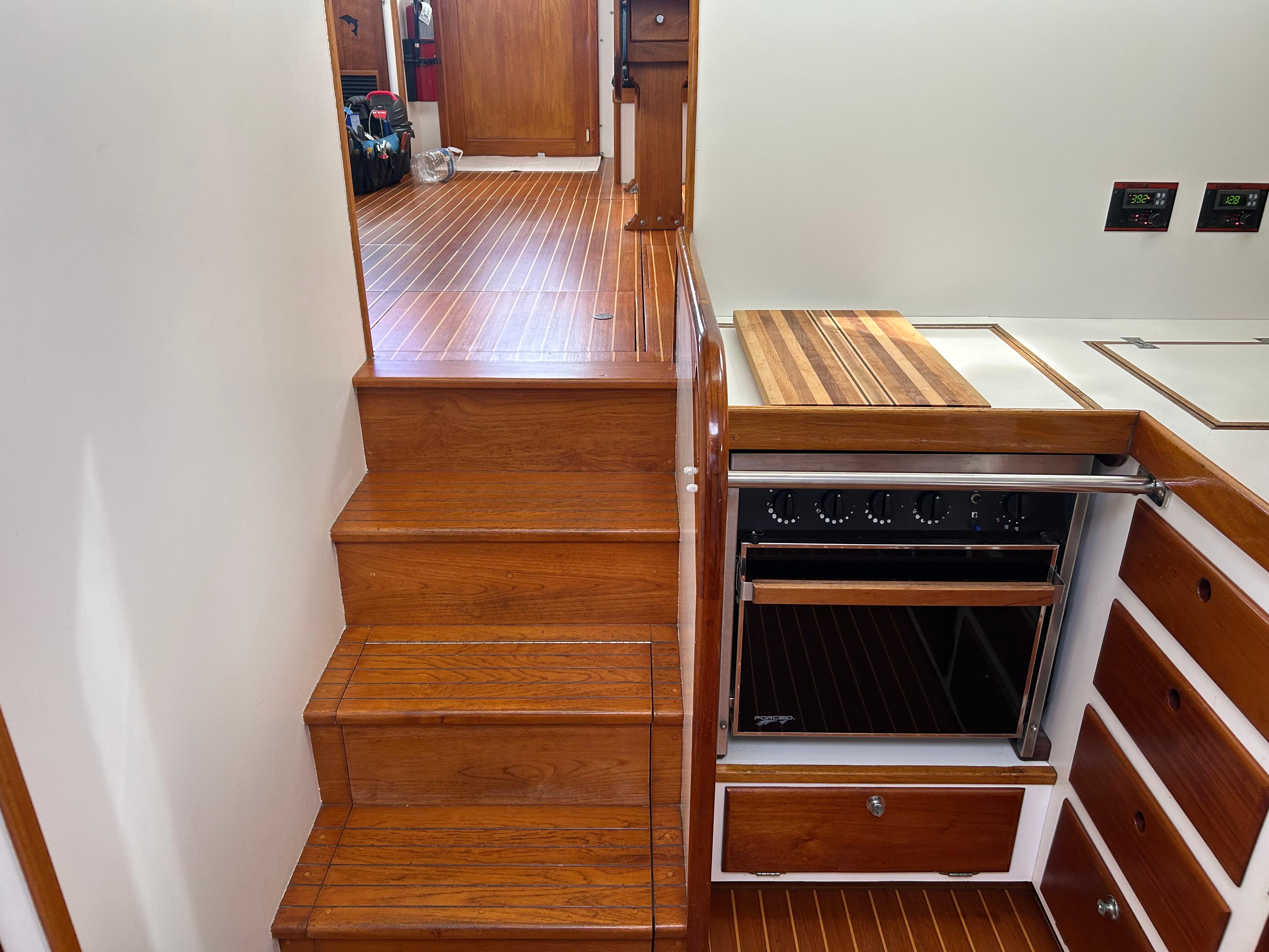 Three steps down to port is the galley with Refrigerator/ Freezer air and water cooled, Propane stove and oven, Double sink, pantry to starboard and storage above and below counter.