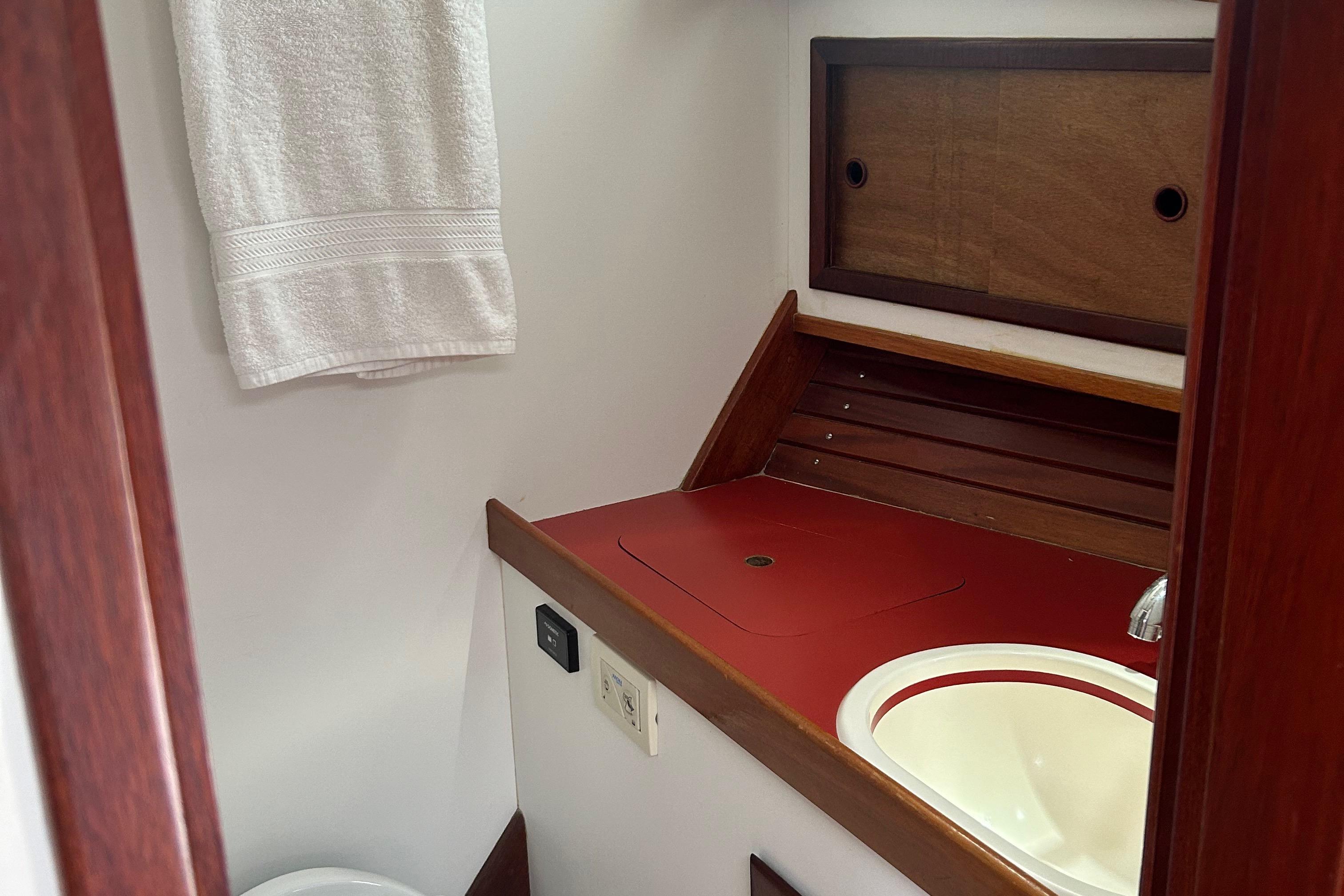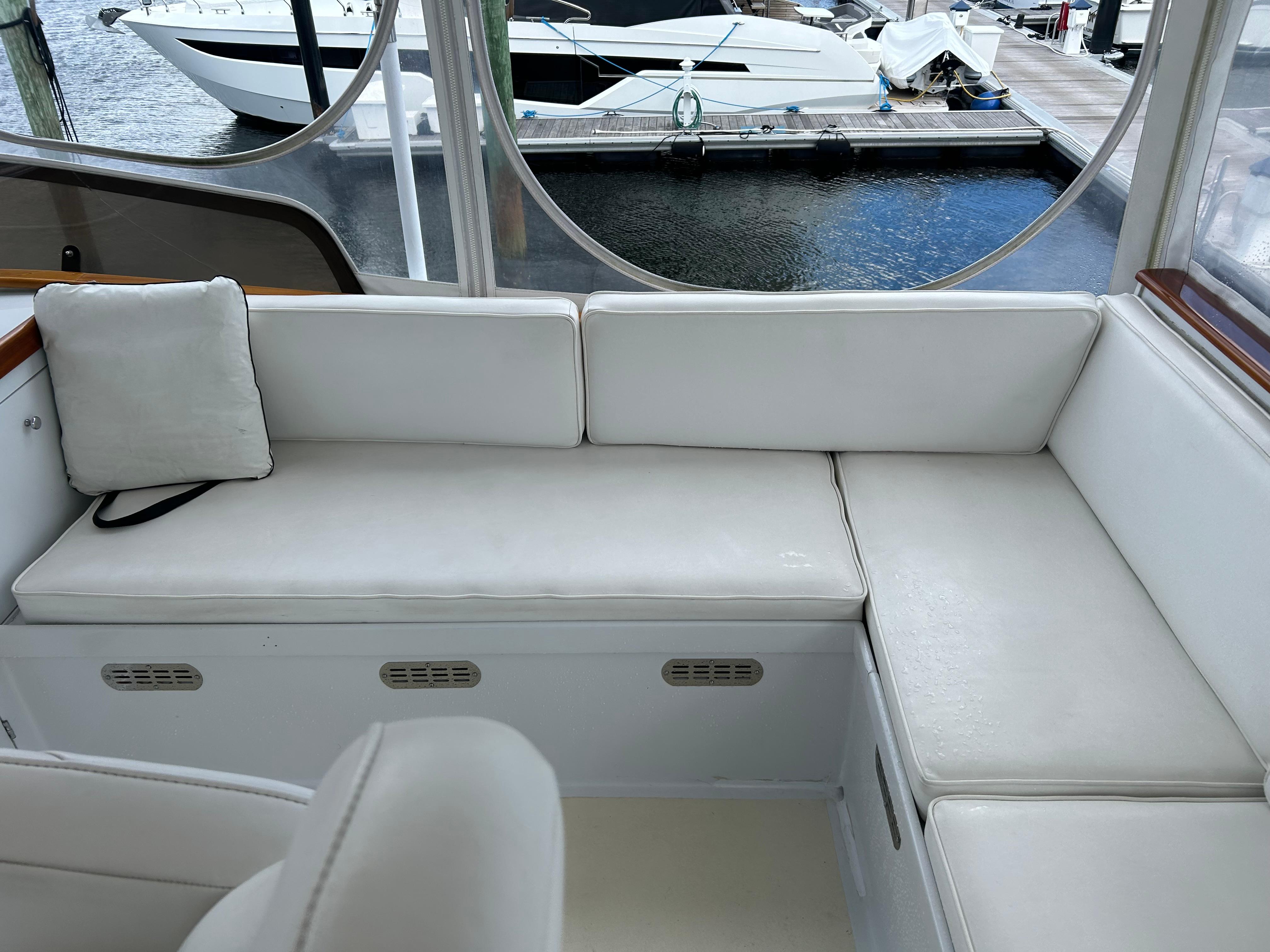 Large comfortable salon with sleeper sofa (queen) in the main salon. Settee to Starboard with folding table, lots of storage for extended cruising. Lower helm, controls and new Bow thruster control.