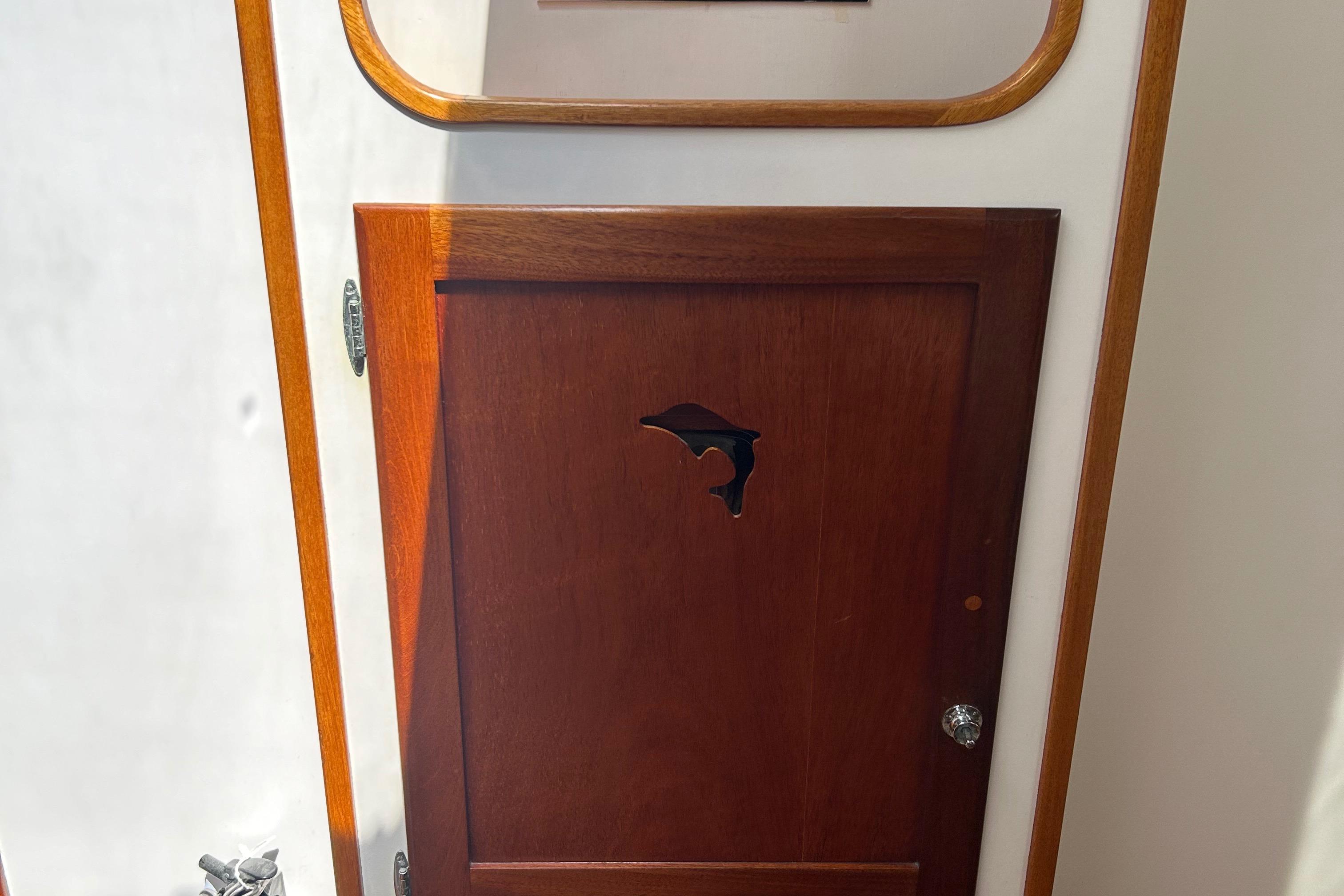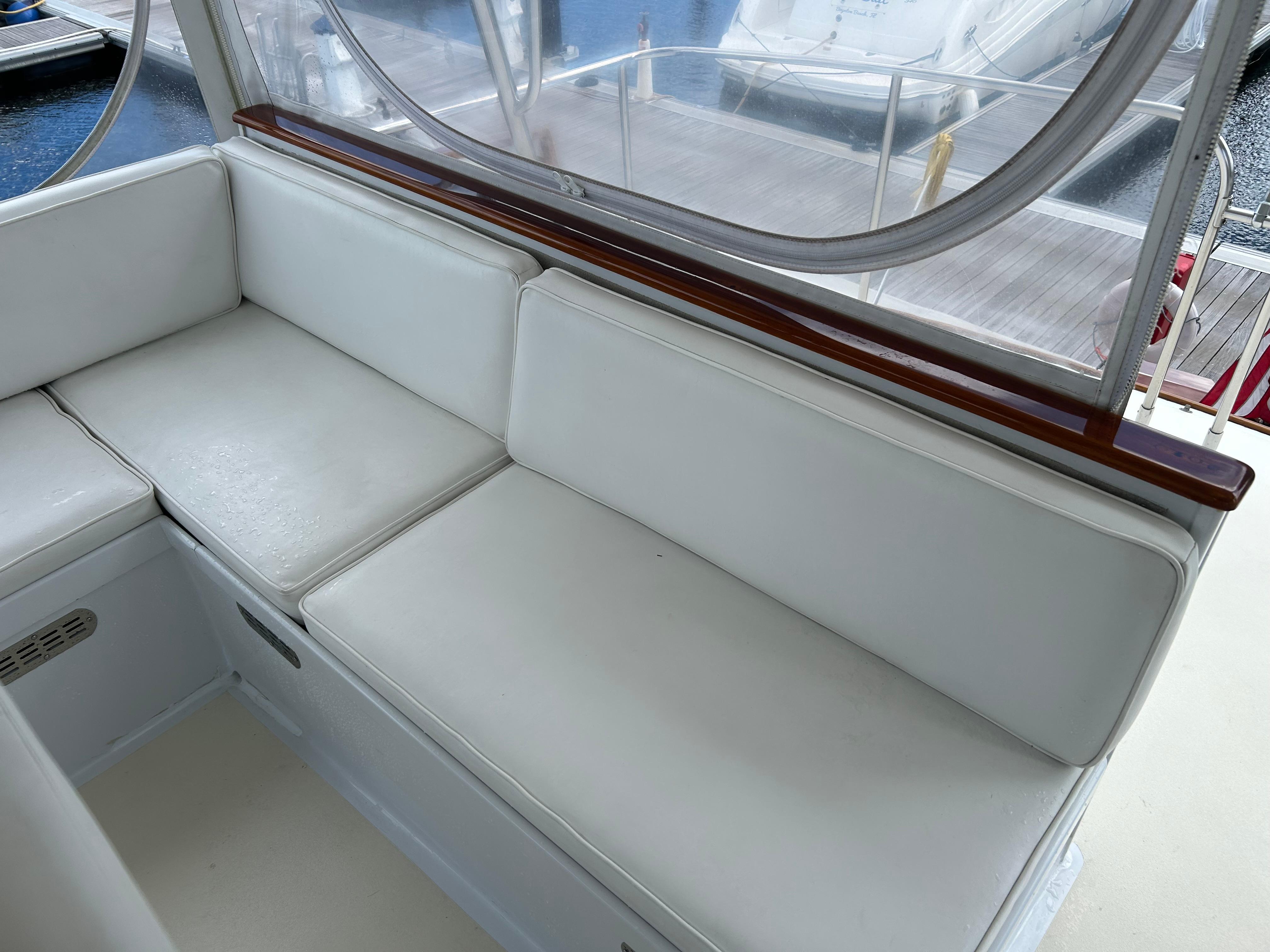 Teak cockpit, cleats, cockpit door and swim ladder off of transom platform, fresh water washdown, cooler under staircase, ladder to flybridge. Three hatches under cockpit sole, tremendous storage.