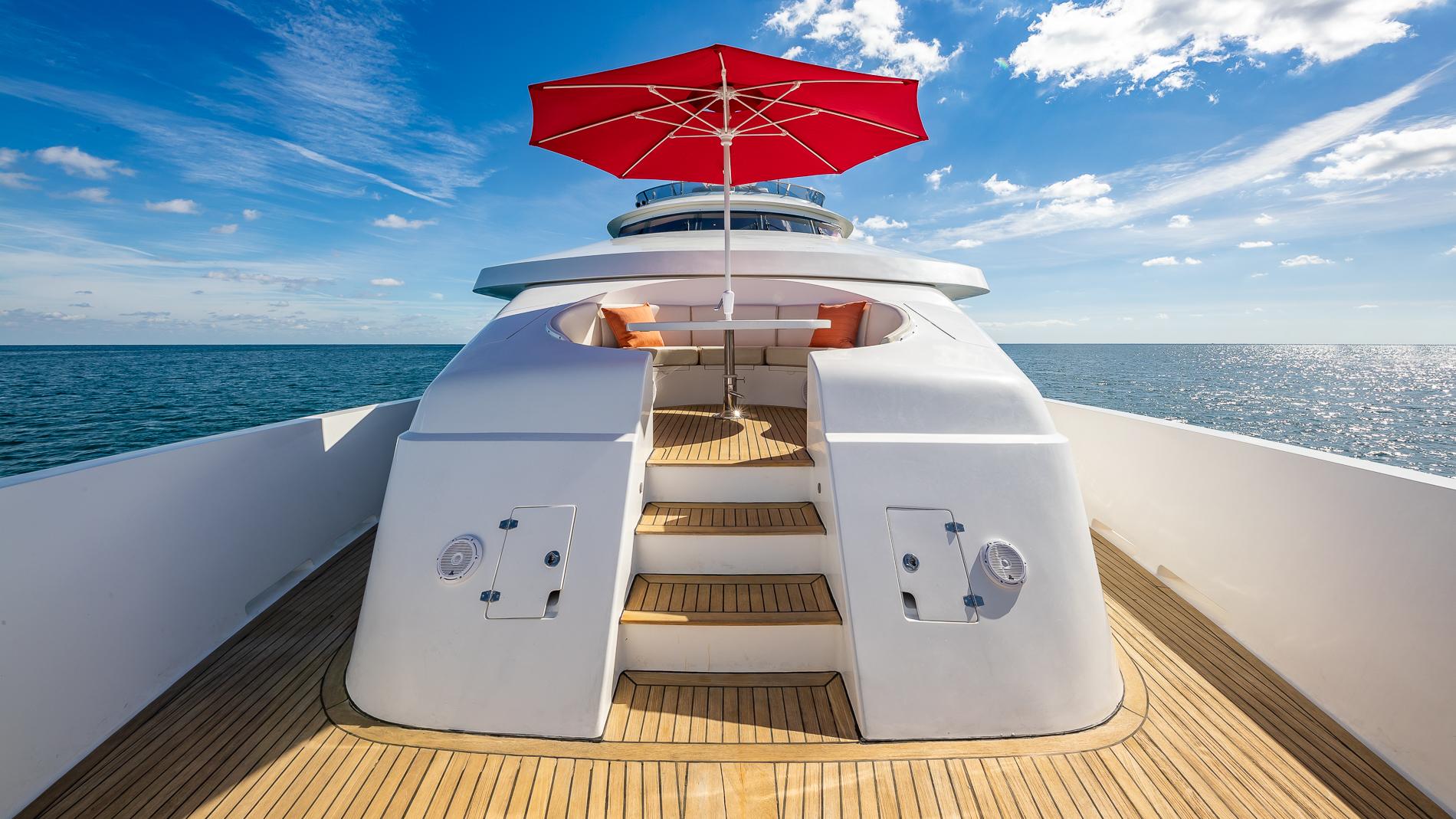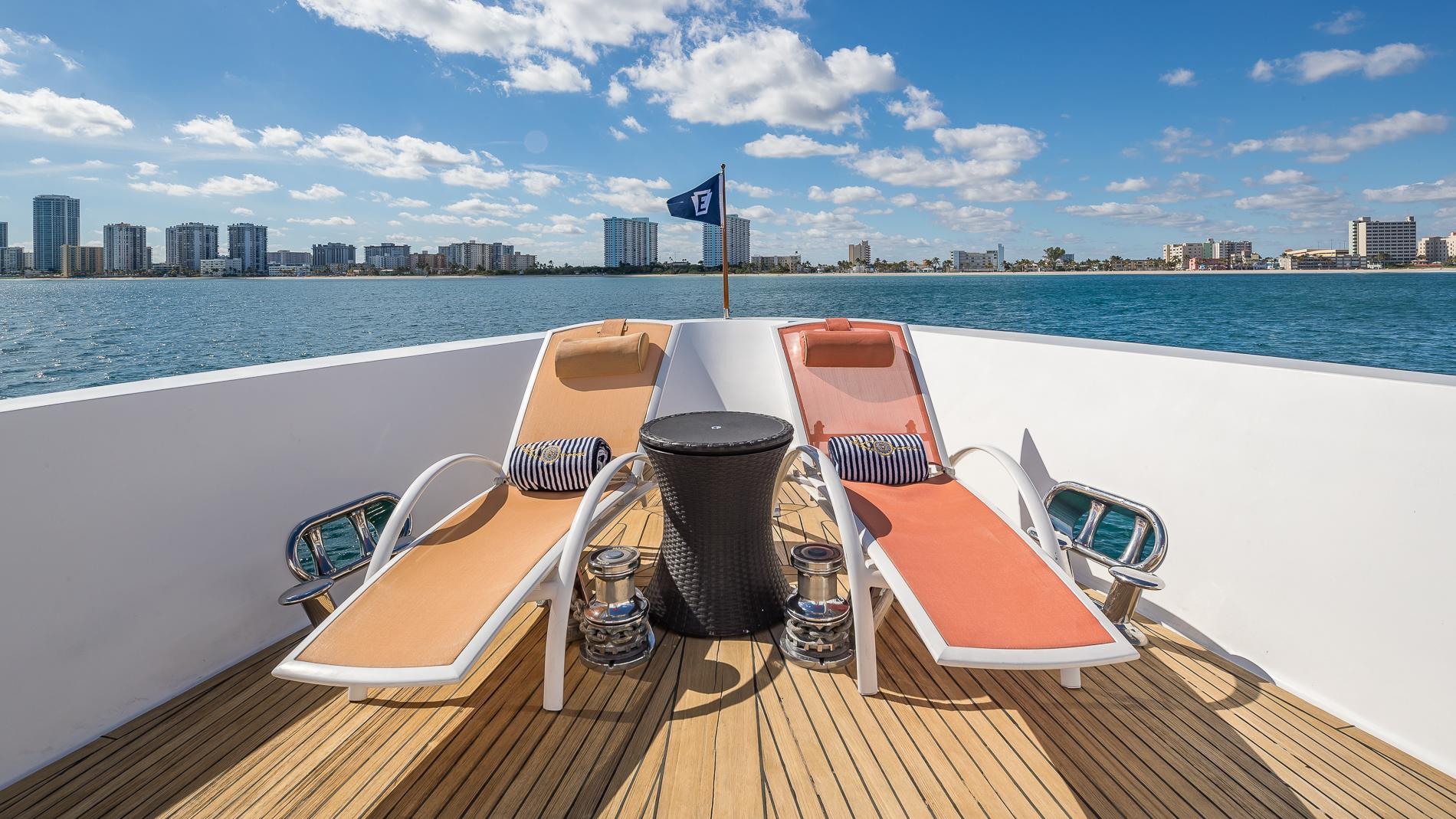 EXTERIORThe large walkaround side decks allow for easy movement forward to the foredeck where the twin anchor windlasses are installed. A unique feature is the raised seating area just aft of the foredeck accessed via the centerline stairway.
