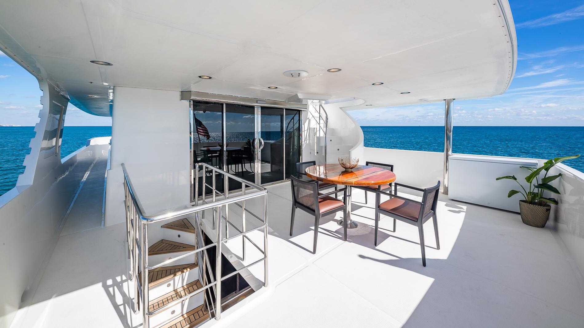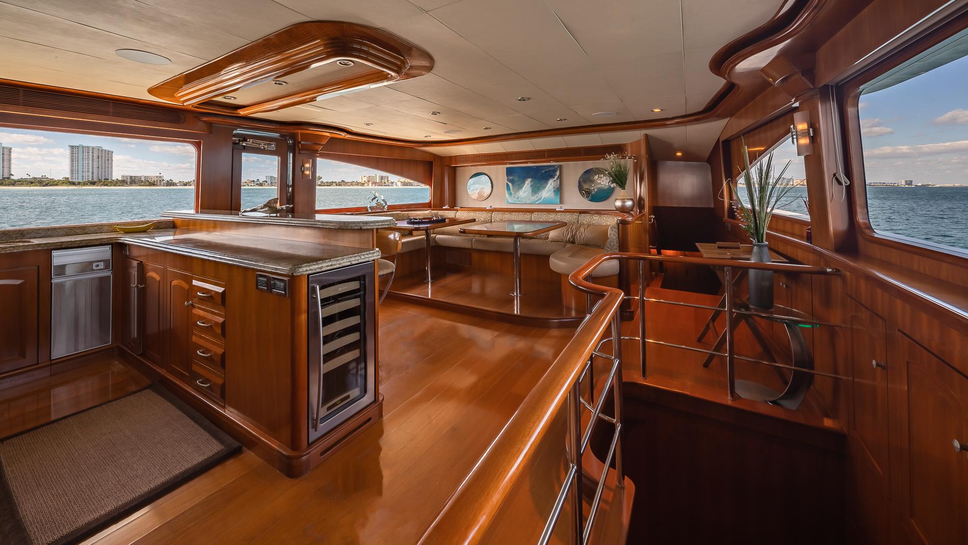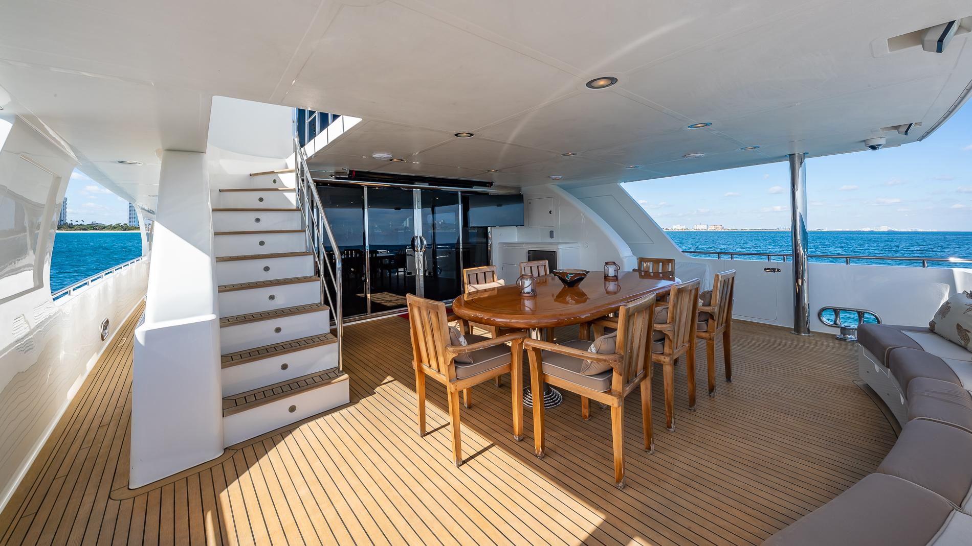 Spacious aft deck comes with a built-in bench seat aft with storage below and large teak table. There is a stairway leading to the flybridge with access to the crew area below. The salon can be accessed via large stainless steel and glass sliding doors.