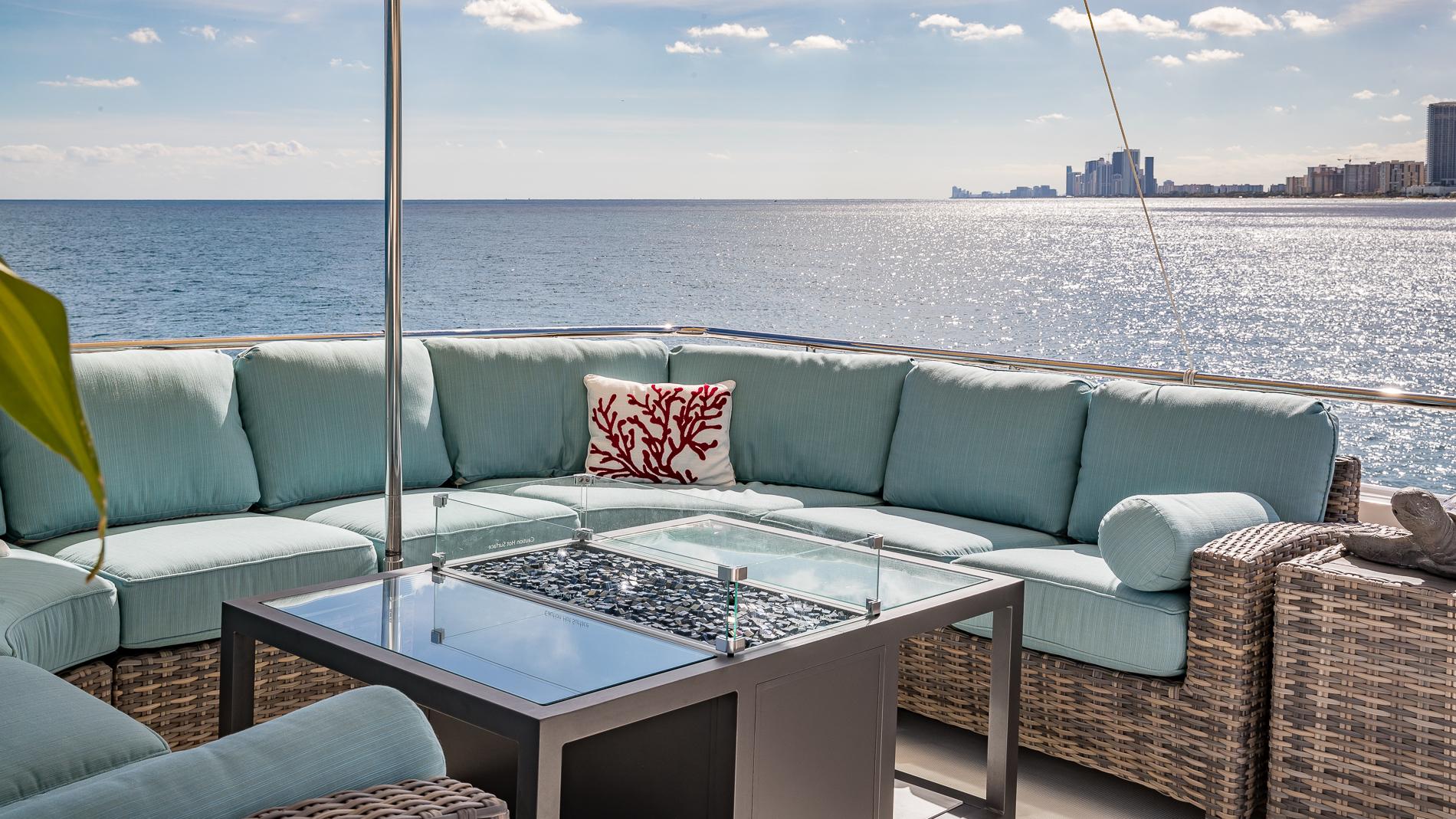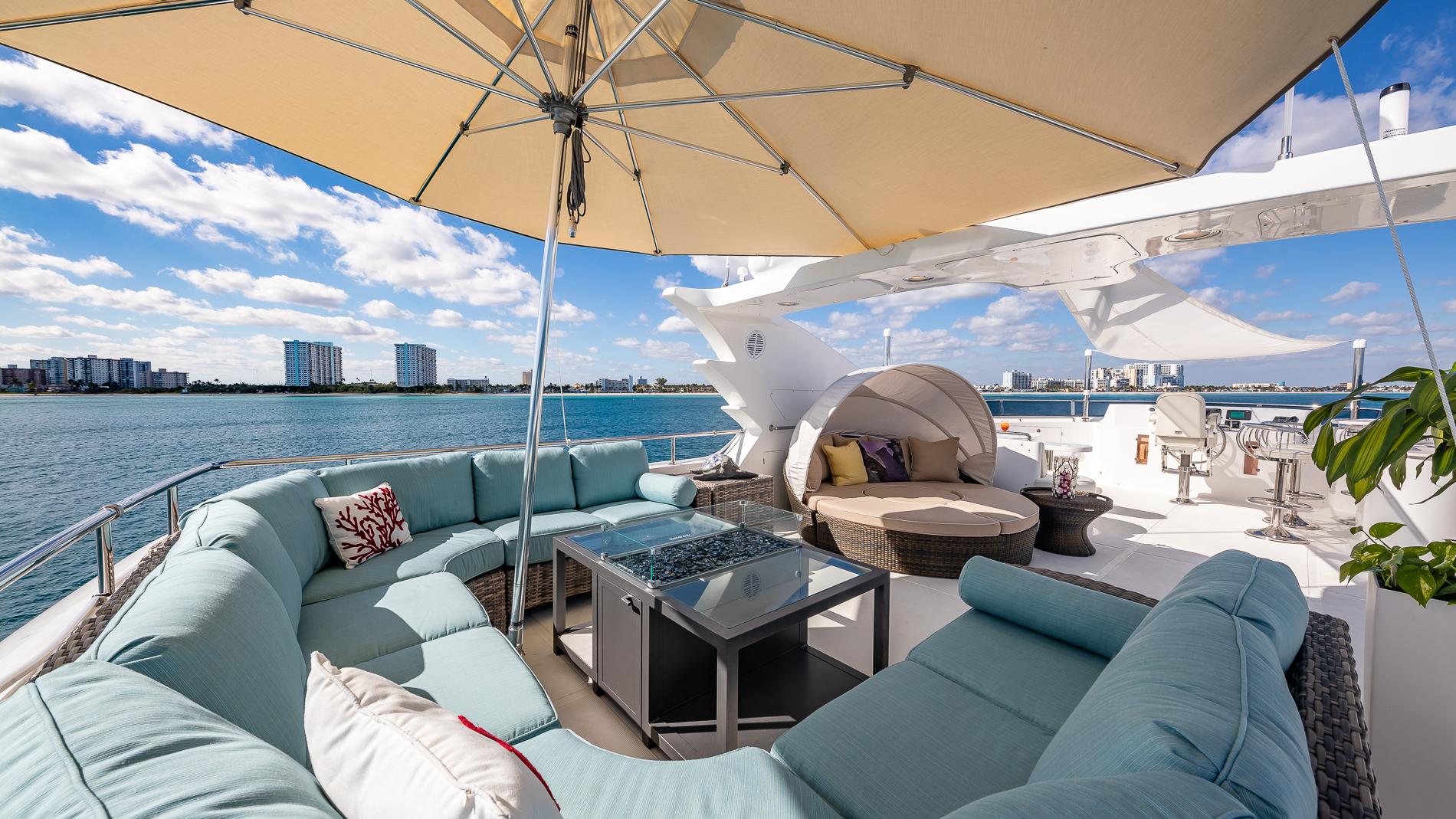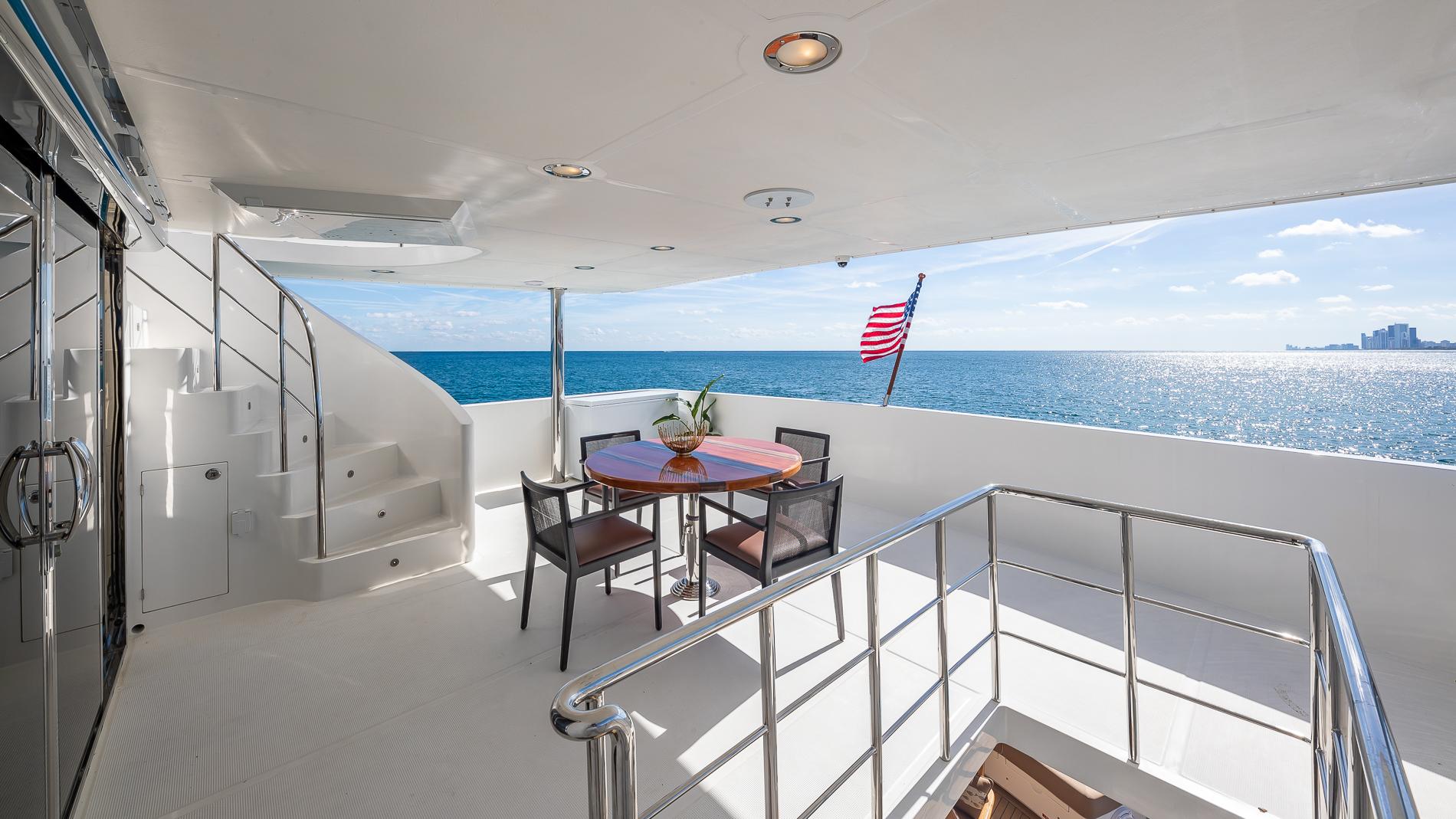 Spacious aft deck comes with a built-in bench seat aft with storage below and large teak table. There is a stairway leading to the flybridge with access to the crew area below. The salon can be accessed via large stainless steel and glass sliding doors.