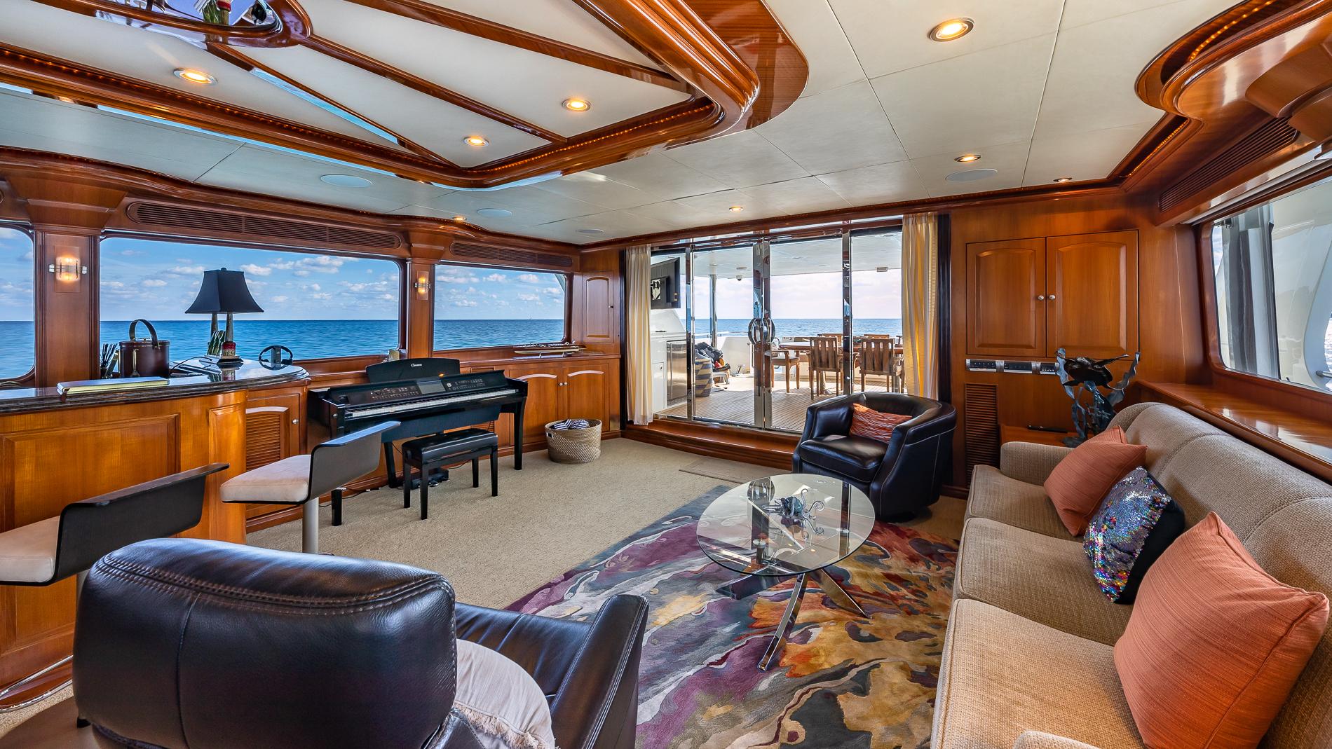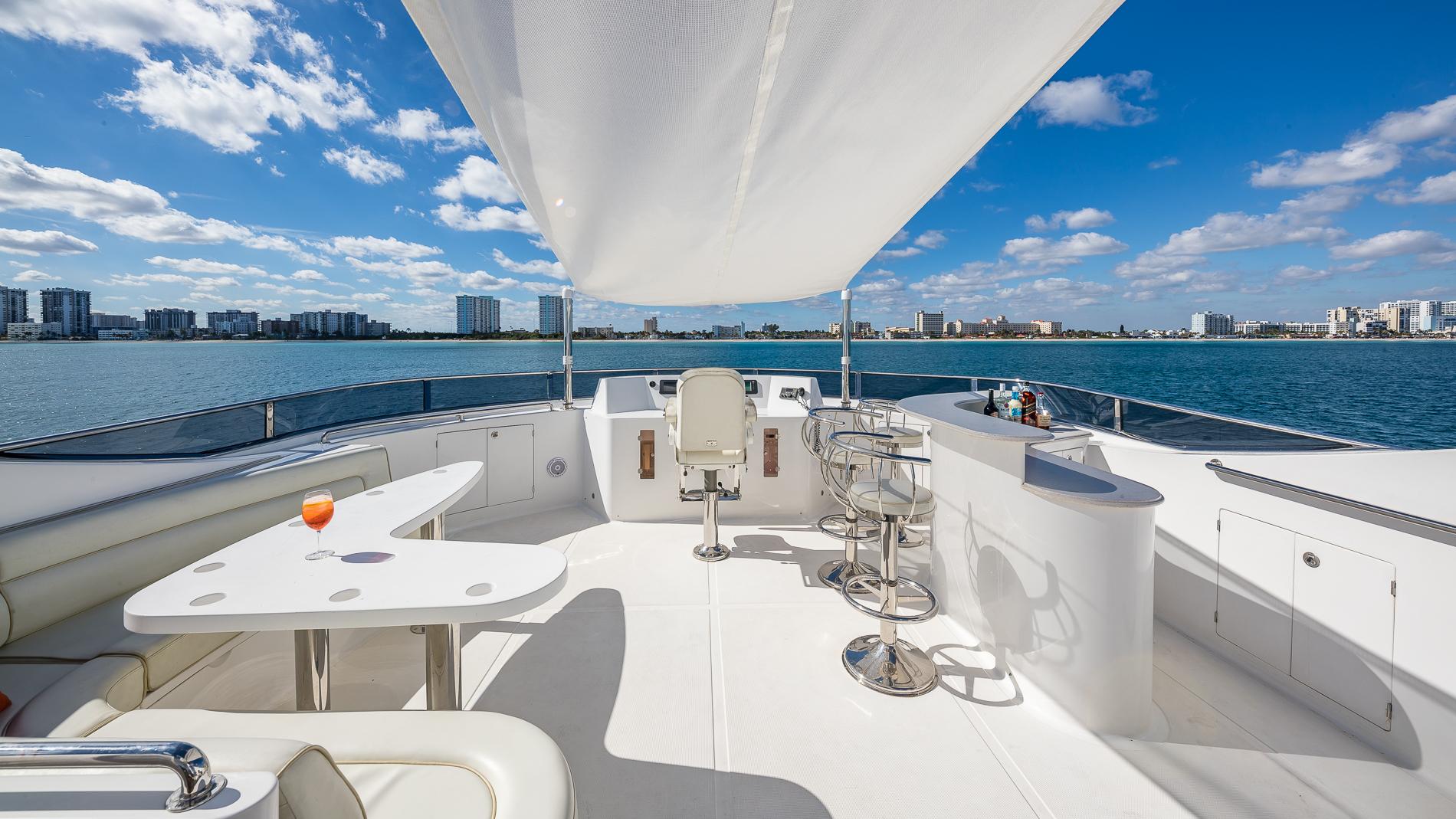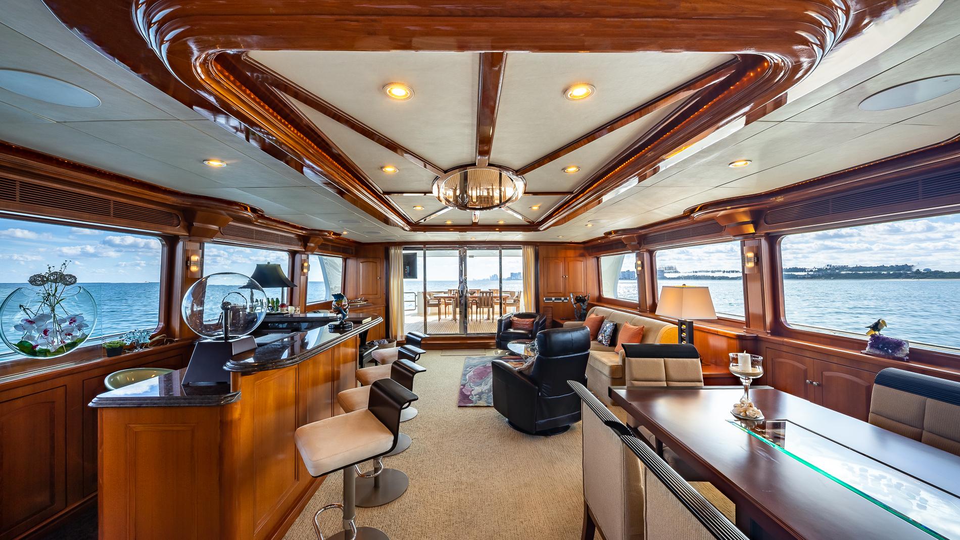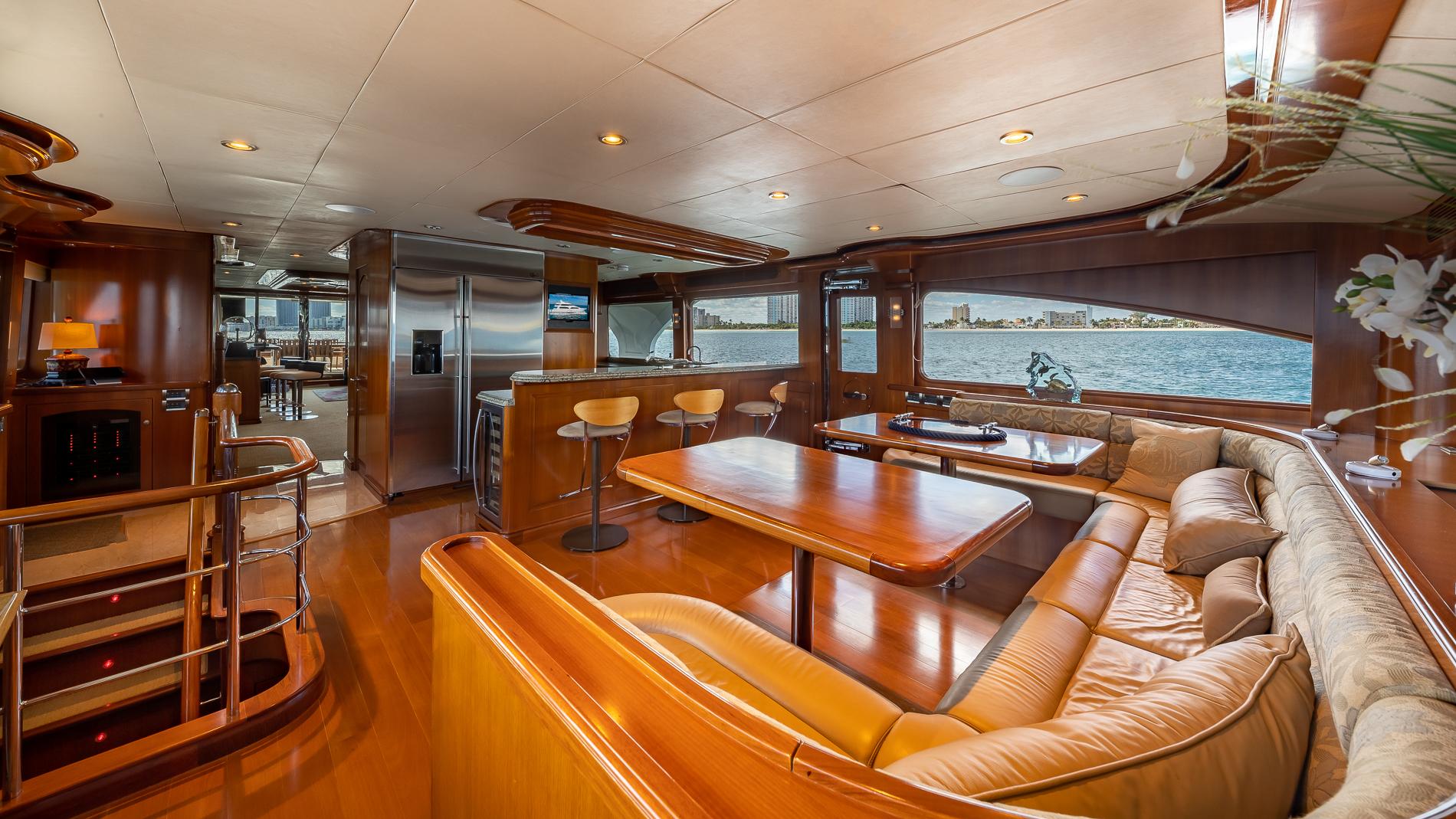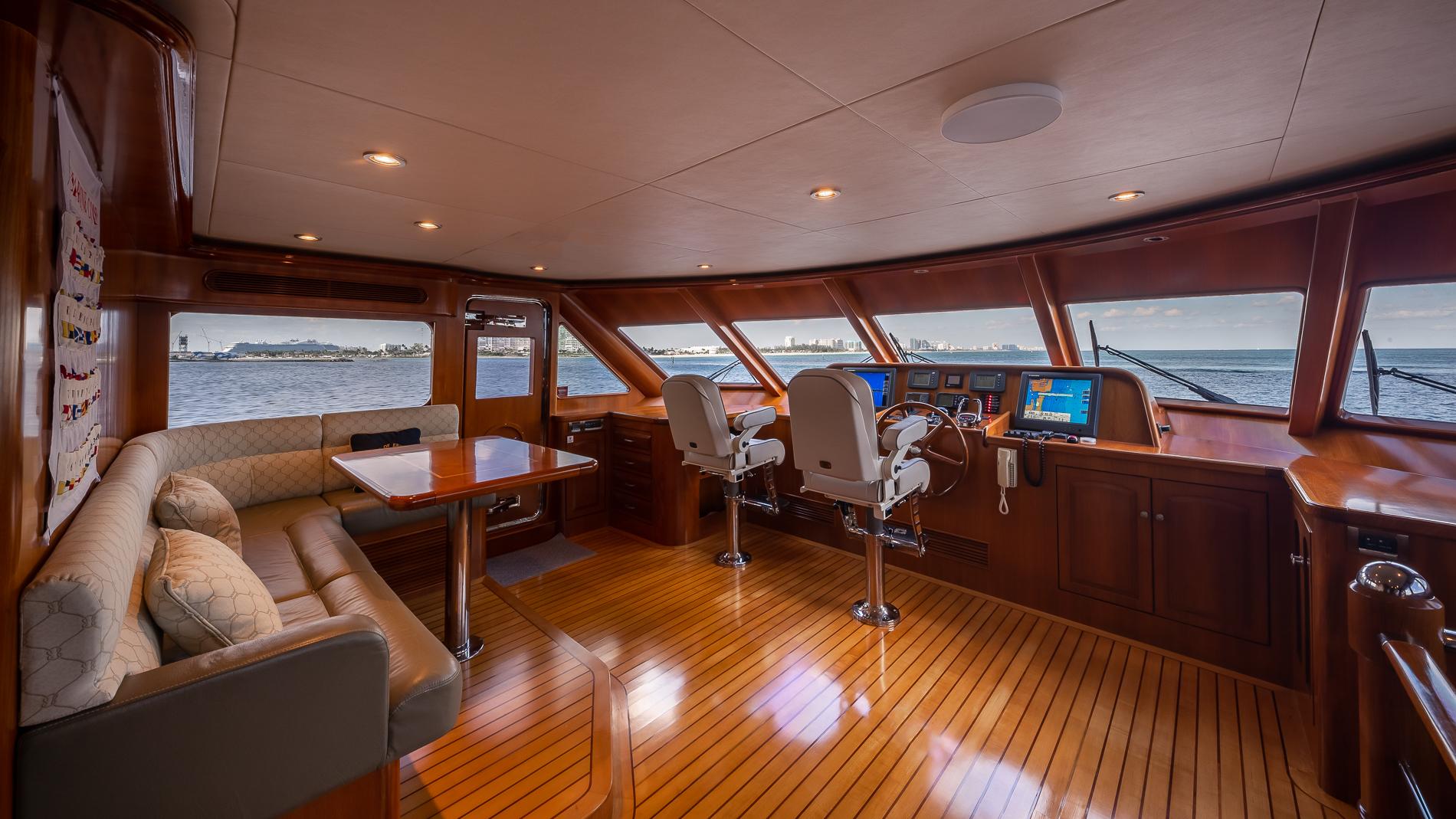 The raised pilothouse has two helm chairs at the station and a large L-shaped seating area aft with table. There is also a small wet bar/service area and access to the skylounge/upper stateroom.