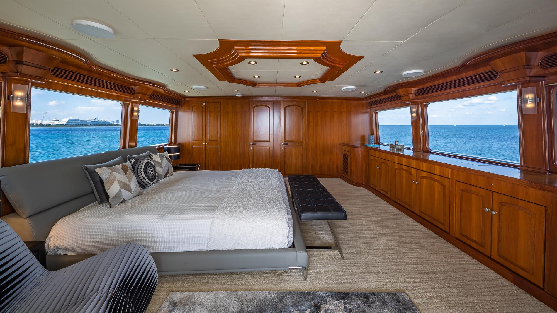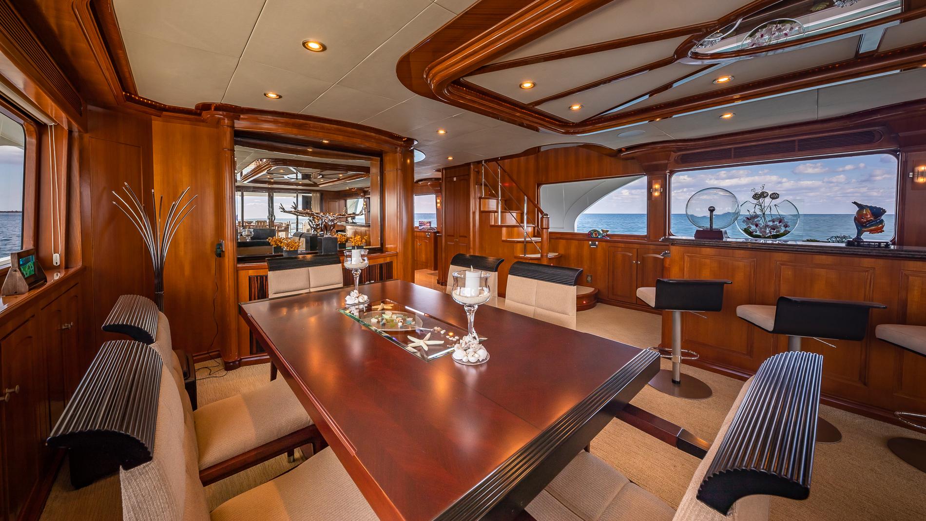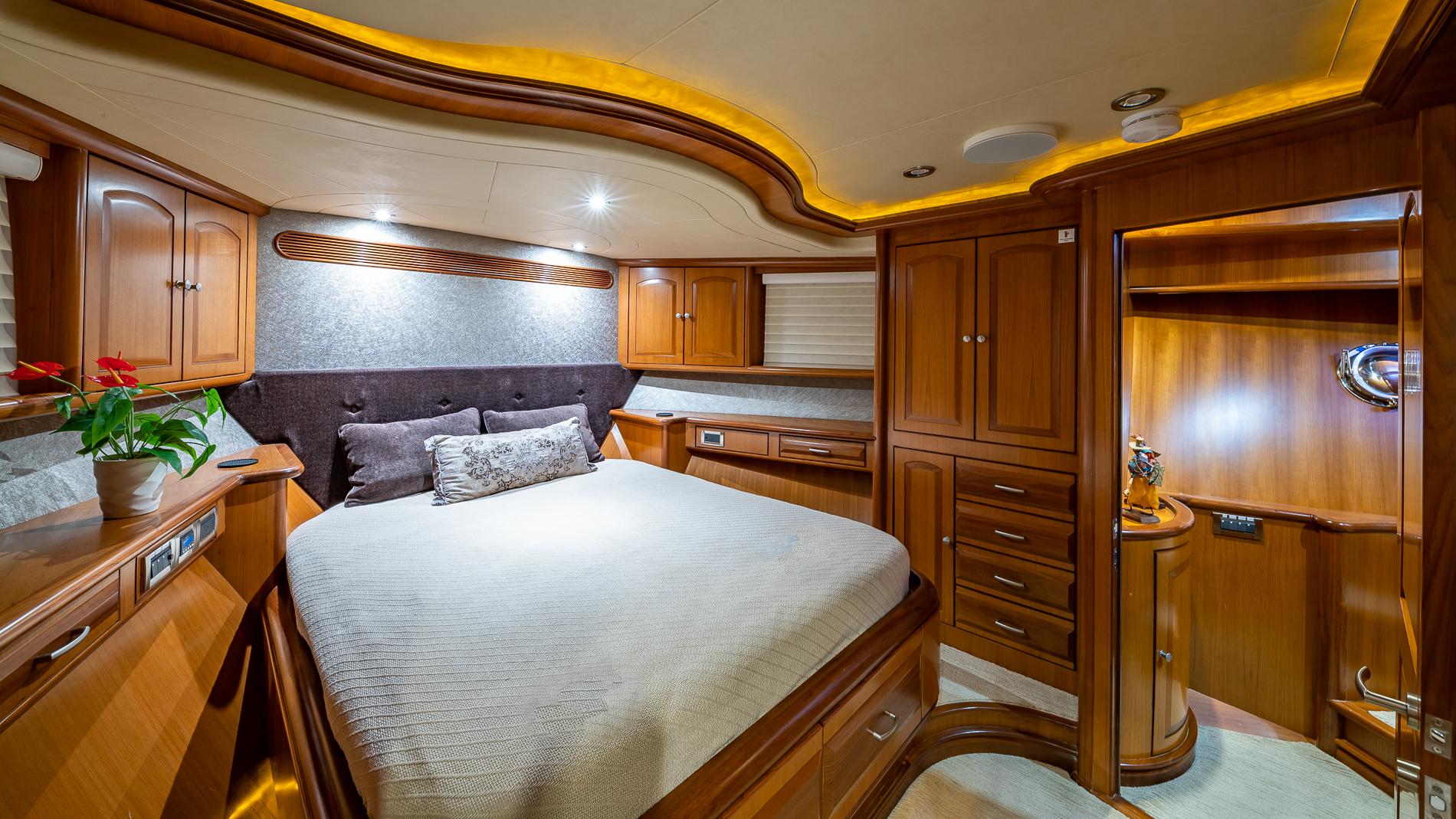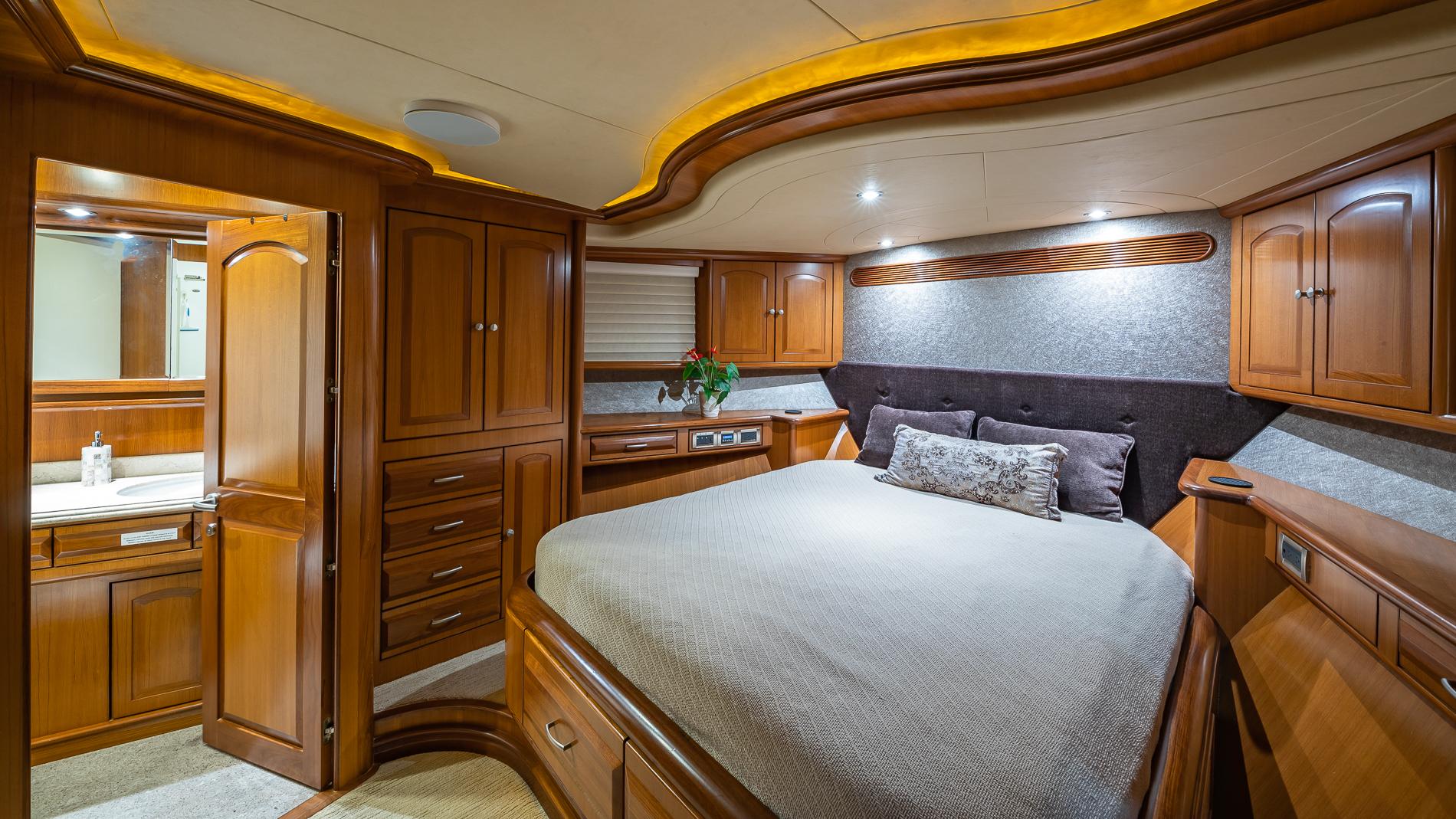 INTERIORThe salon offers plenty of seating area and storage. Forward is the formal dining area with a table for seating six. Through the starboard companionway is the country-style kitchen with bar stools and a large wrap around seating area with two tables.Full-beam master with a seating area and excellent storage in lockers and drawers. A unique feature is the large upper VIP which is located aft of the pilothouse.