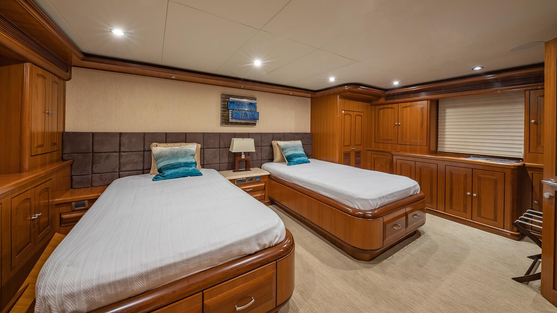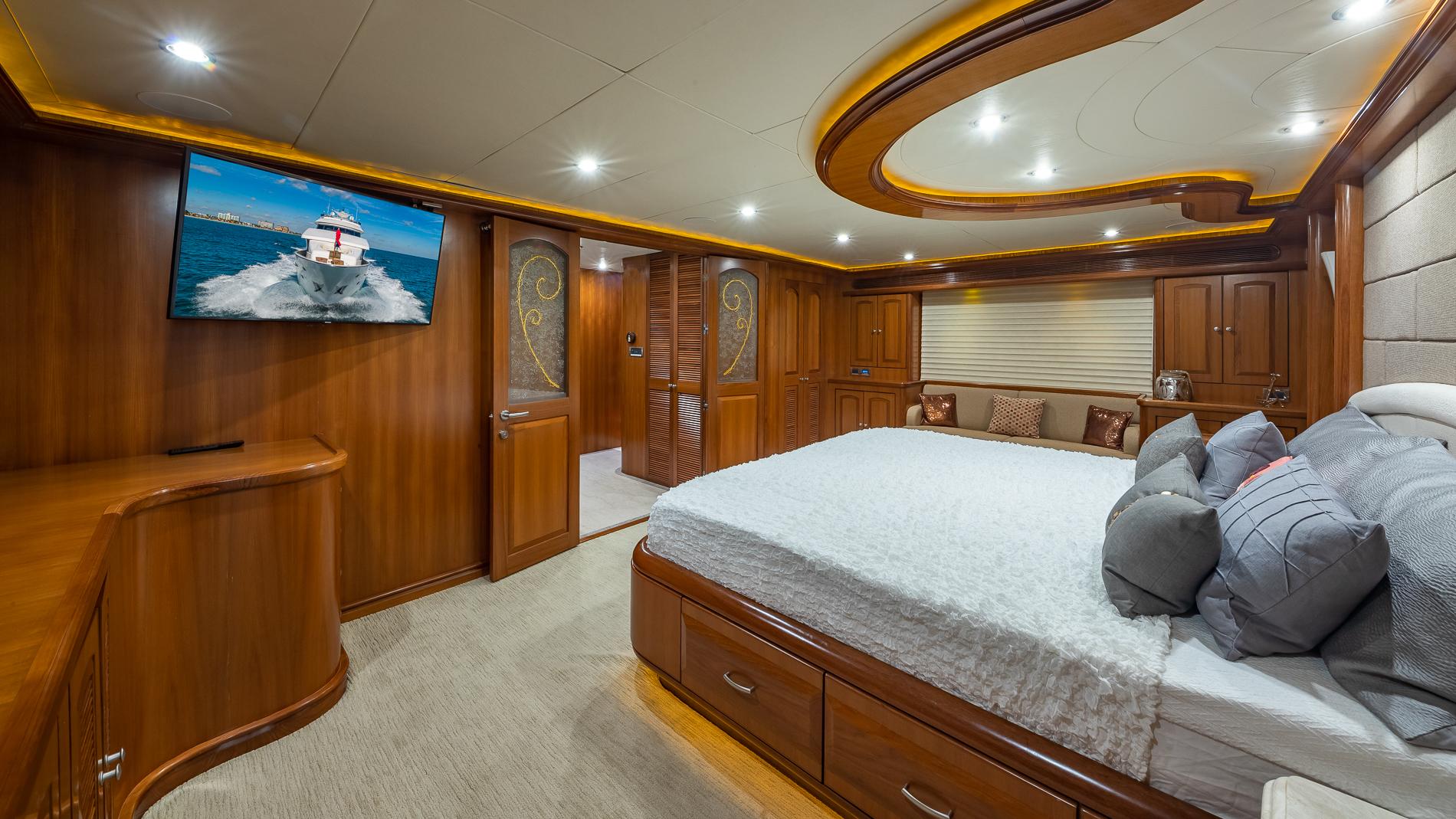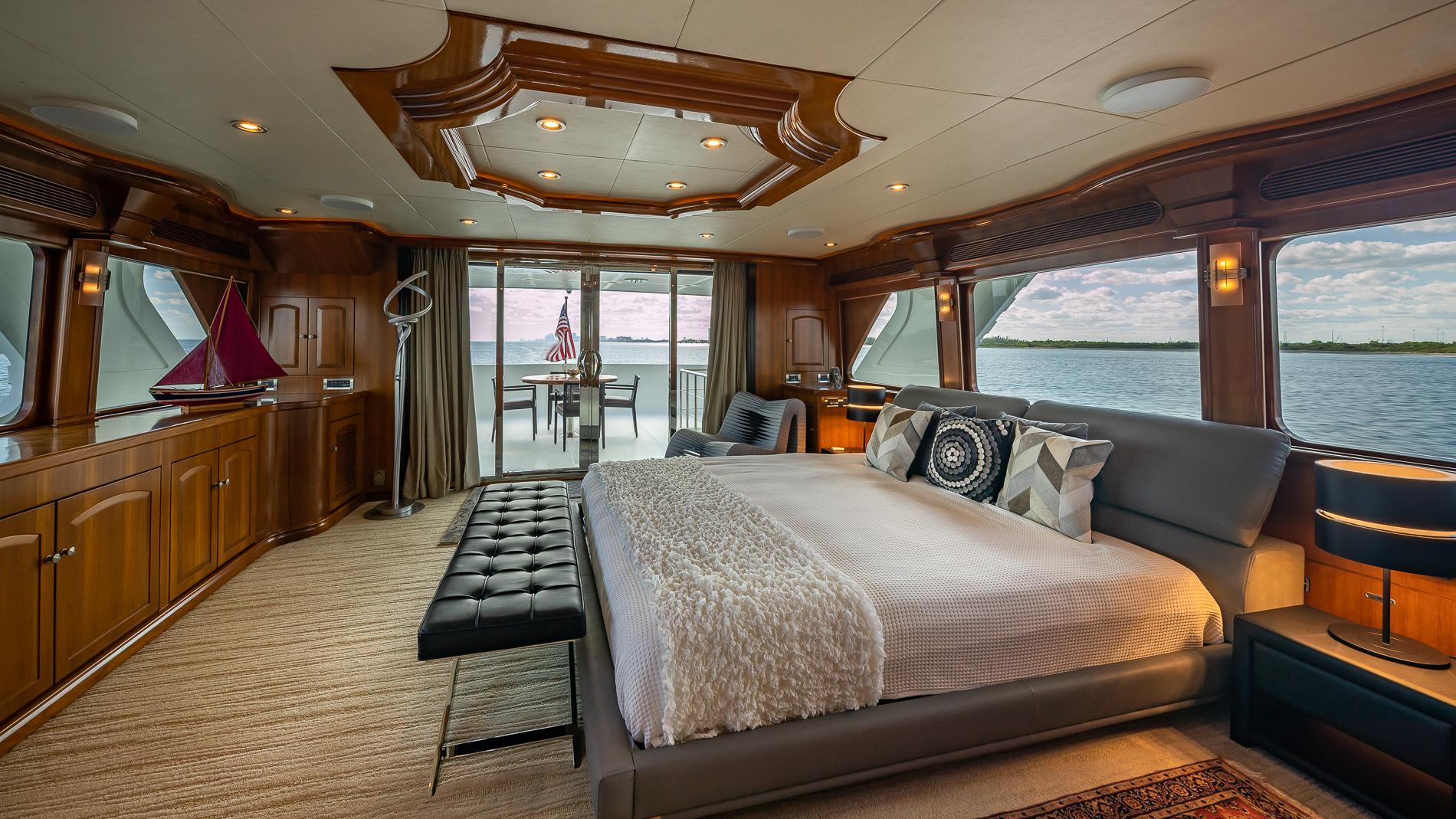 INTERIORThe salon offers plenty of seating area and storage. Forward is the formal dining area with a table for seating six. Through the starboard companionway is the country-style kitchen with bar stools and a large wrap around seating area with two tables.Full-beam master with a seating area and excellent storage in lockers and drawers. A unique feature is the large upper VIP which is located aft of the pilothouse.