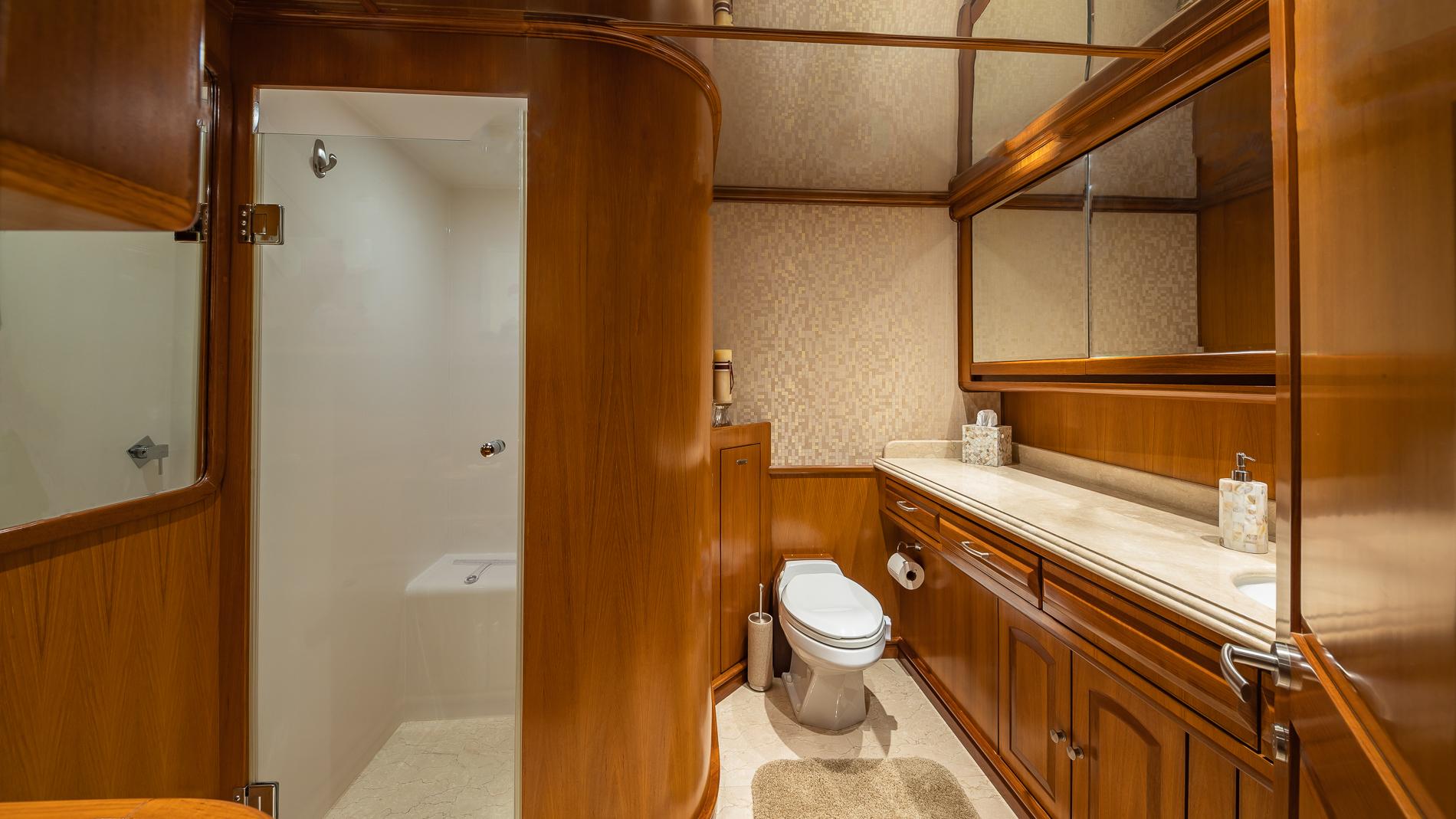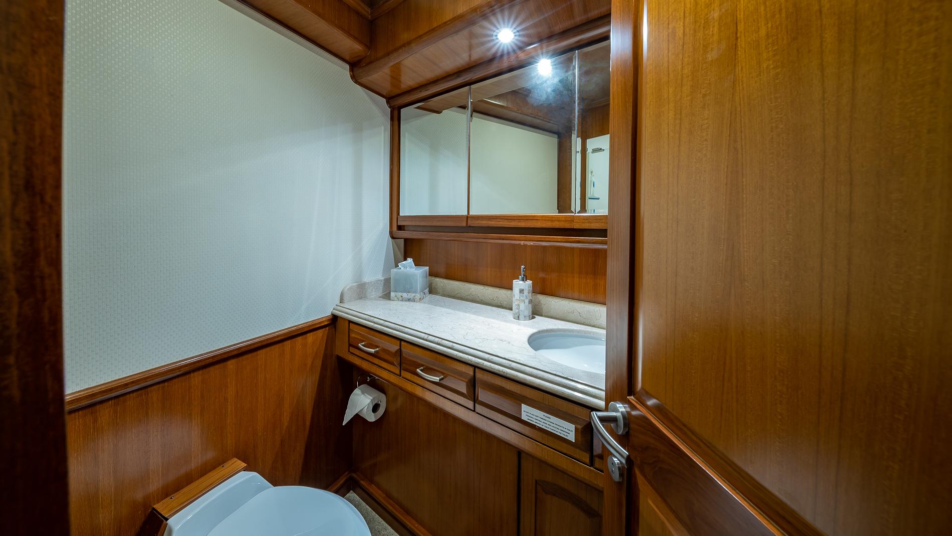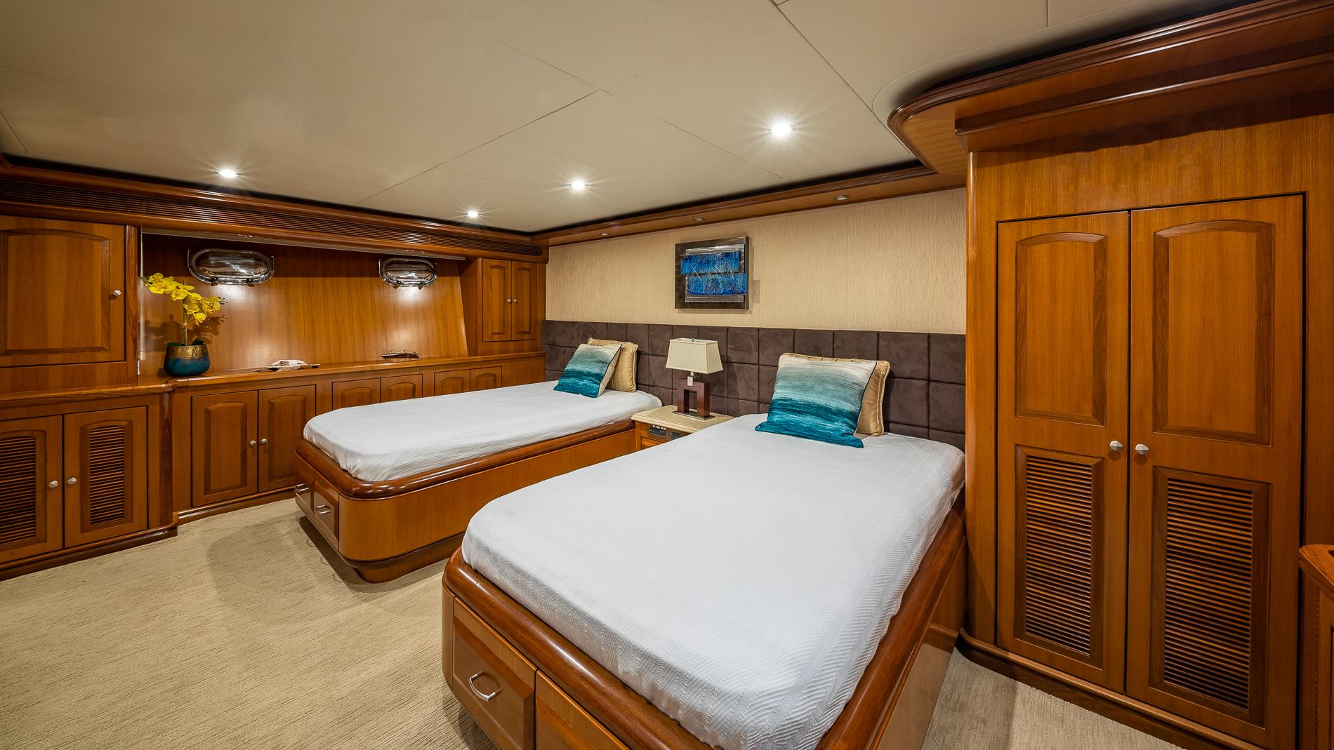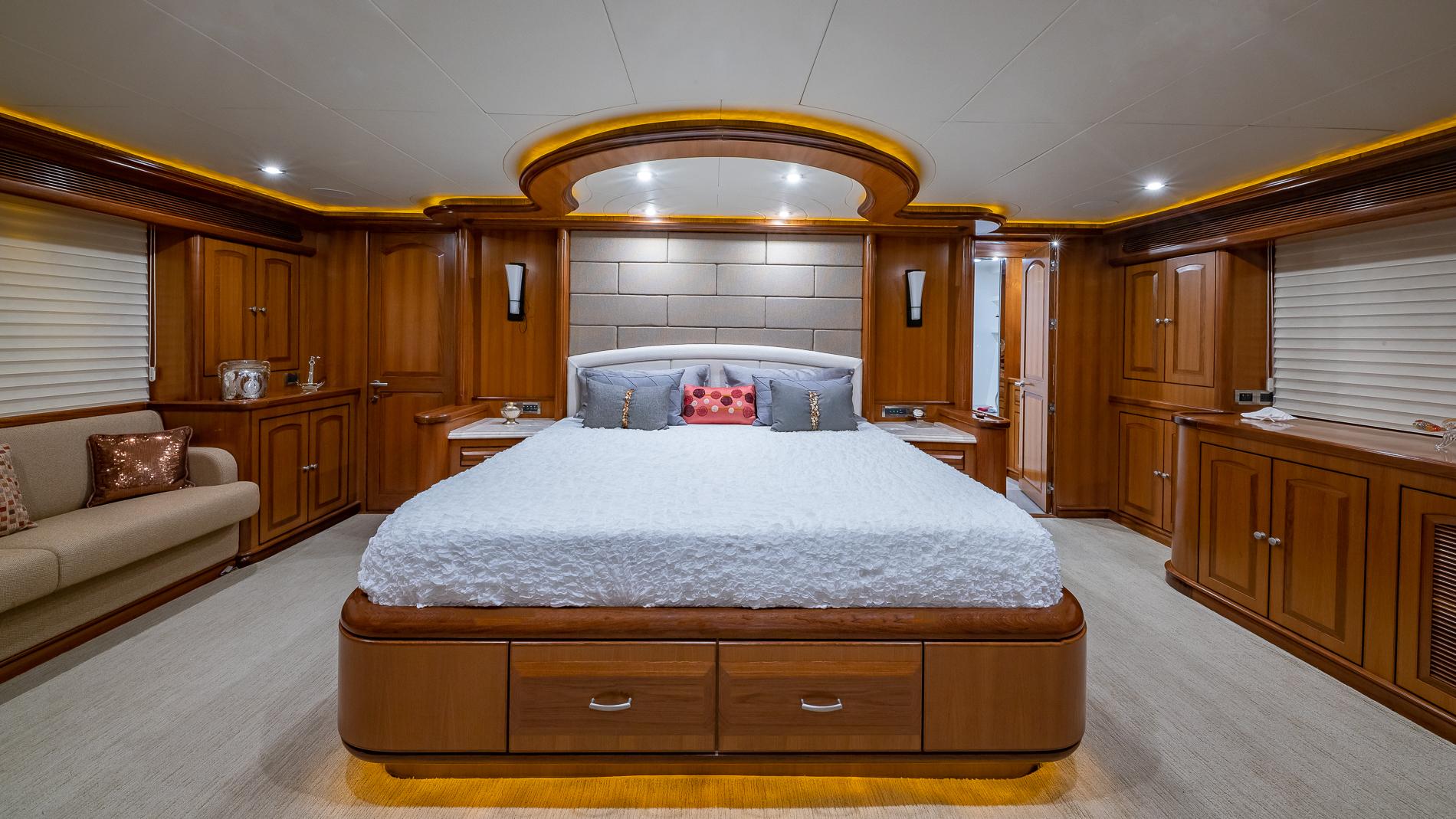 INTERIORThe salon offers plenty of seating area and storage. Forward is the formal dining area with a table for seating six. Through the starboard companionway is the country-style kitchen with bar stools and a large wrap around seating area with two tables.Full-beam master with a seating area and excellent storage in lockers and drawers. A unique feature is the large upper VIP which is located aft of the pilothouse.