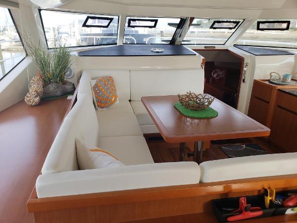 The Aquila 44 Power Catamaran was developed to be an exceptionally comfortable cruising boat; placing advanced technology at the forefront of all design and build decisions. Luxury amenities include Yacht Controller, watermaker, 2 Solar Panels, fresh water flush system, spacious salon and galley with 360 degree view, stainless steel sink, fridge and freezer. The 3-cabin, 3-head yacht features a forward cabin that spans her beam of 21' 6" and two aft cabins with ample headroom and large windows. Two of the three en-suite heads include separate shower stalls and teak flooring.  The oversized flybridge features Simard electronics package, electric grill, added enclosure and  seating on either side of the helm station.