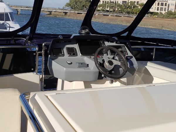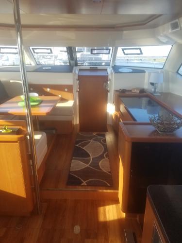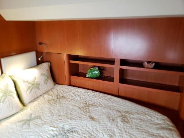 On the Aquila 44 you will enjoy the 360˚ view from the spacious salon and galley that features a large seating area, hidden TV stowage and plenty of storage to make a live-aboard or cruising easy and pleasant. Galley features include Corian countertops, electric fridge and freezer, stove, and stainless steel microwave oven as well as a double stainless steel sink. The large staterooms each feature ample headroom and large windows for excellent views. A fresh water flush, separate shower stall and teak flooring compliment the boat’s design and exceptional living comforts. Additional features include an oversized flybridge with added enclosure, electric grill, and sunpad seating on either side of the central helm station and Aquila's revolutionary bridge to bow direct access.