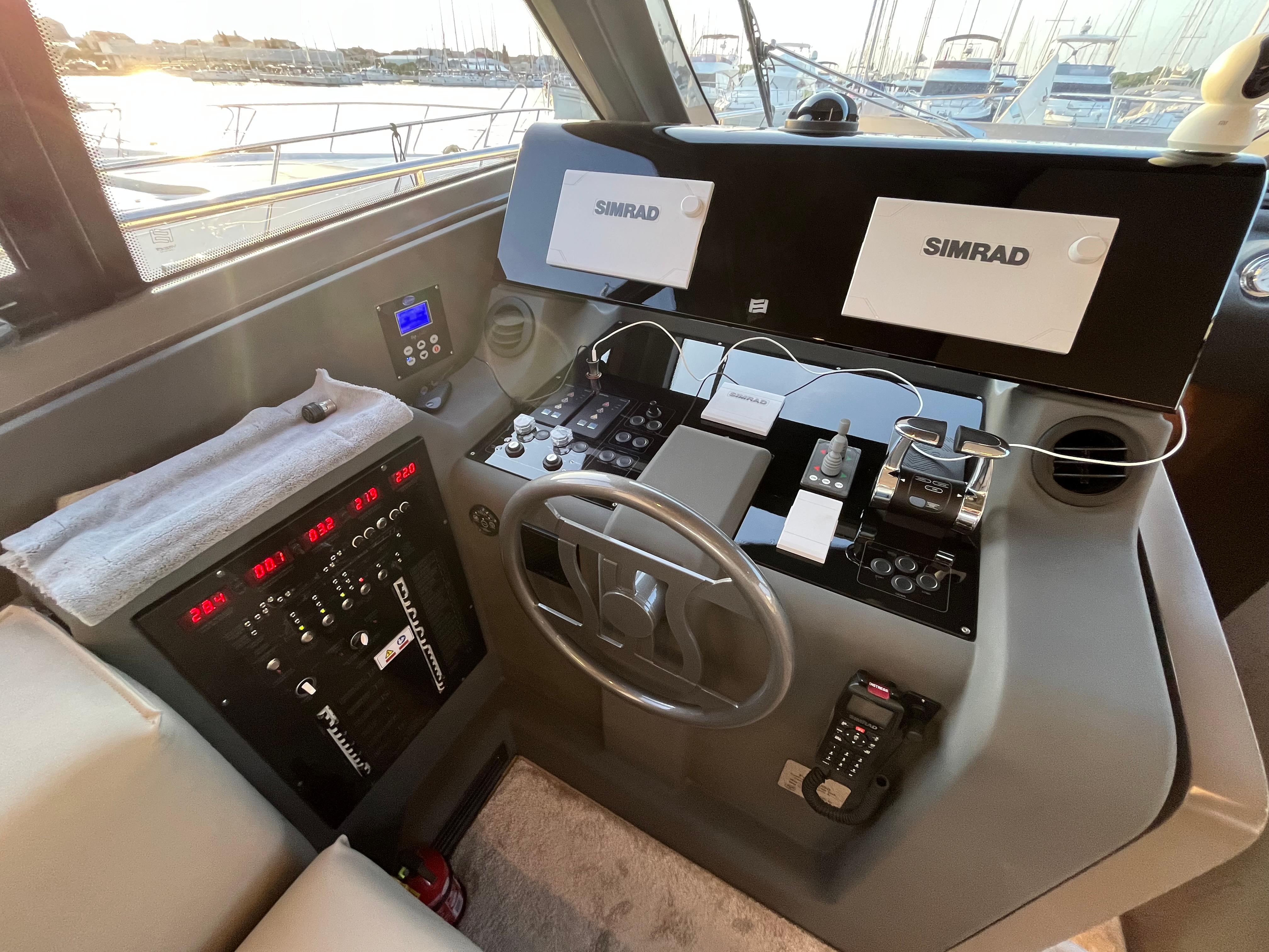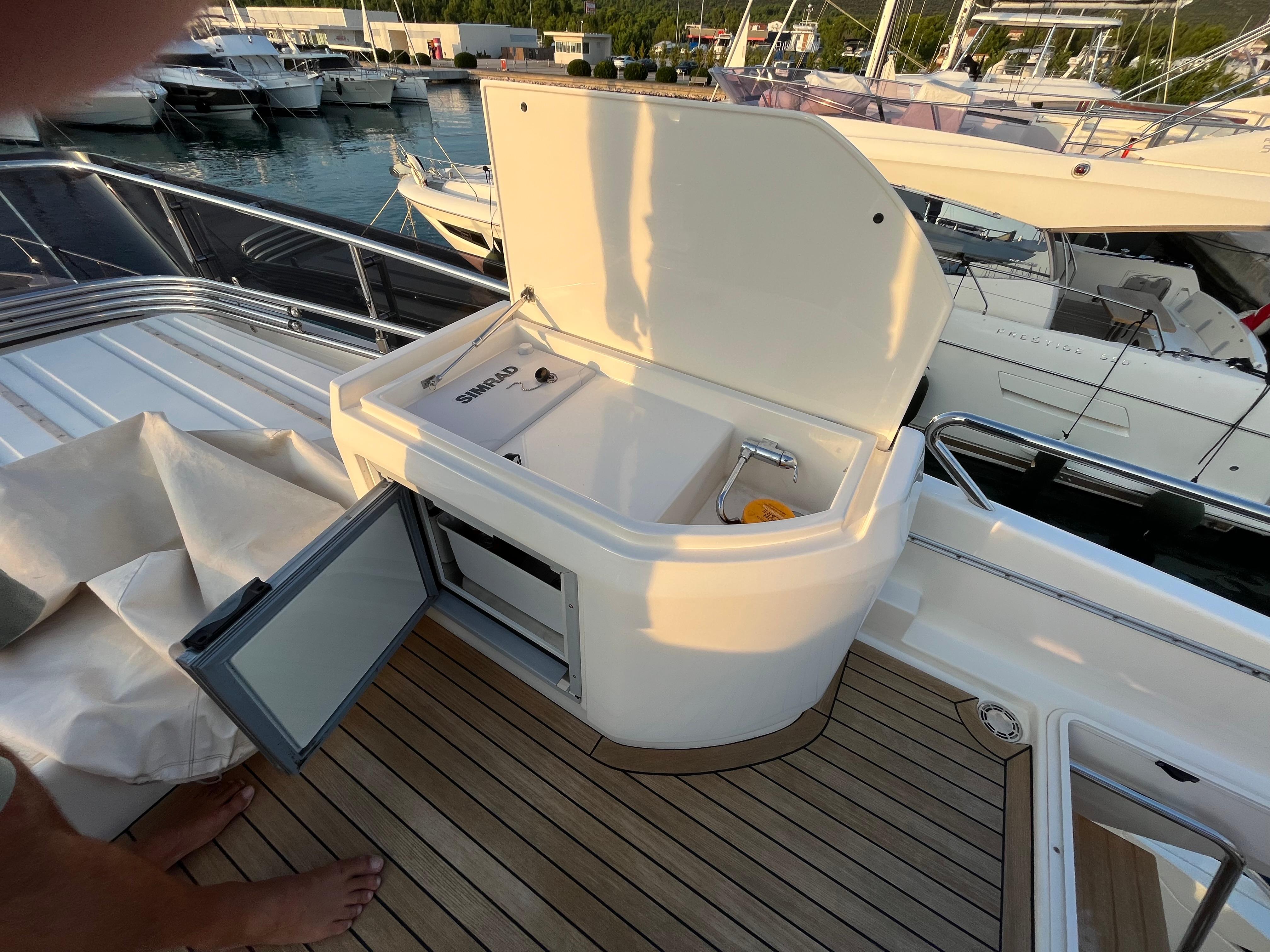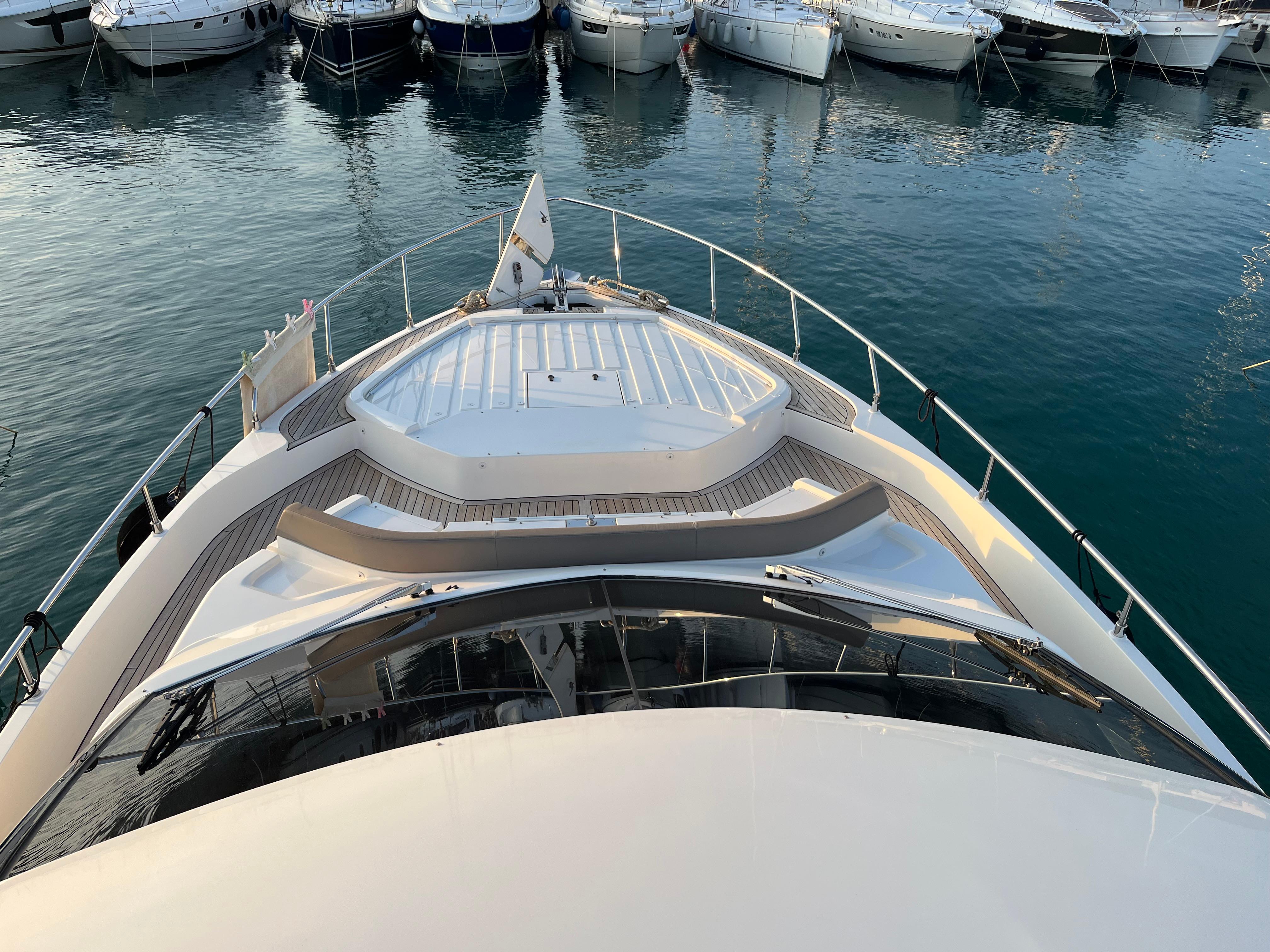 This yacht’s interior spaces and onboard equipment allows it to be on an equal standing with much larger yachts. Many outdoor relaxation areas have been conceived: the forward dinette area, furnished with facing sofas and a table; the large sunpad on the deckhouse; and the cockpit, featuring a large aft sofa and a table. On the flybridge, the storage cabinet and the restyled, small-size pilot station instrument panel allow to extend the relaxation areas - both the sunpad and the comfortable dining area - even more.