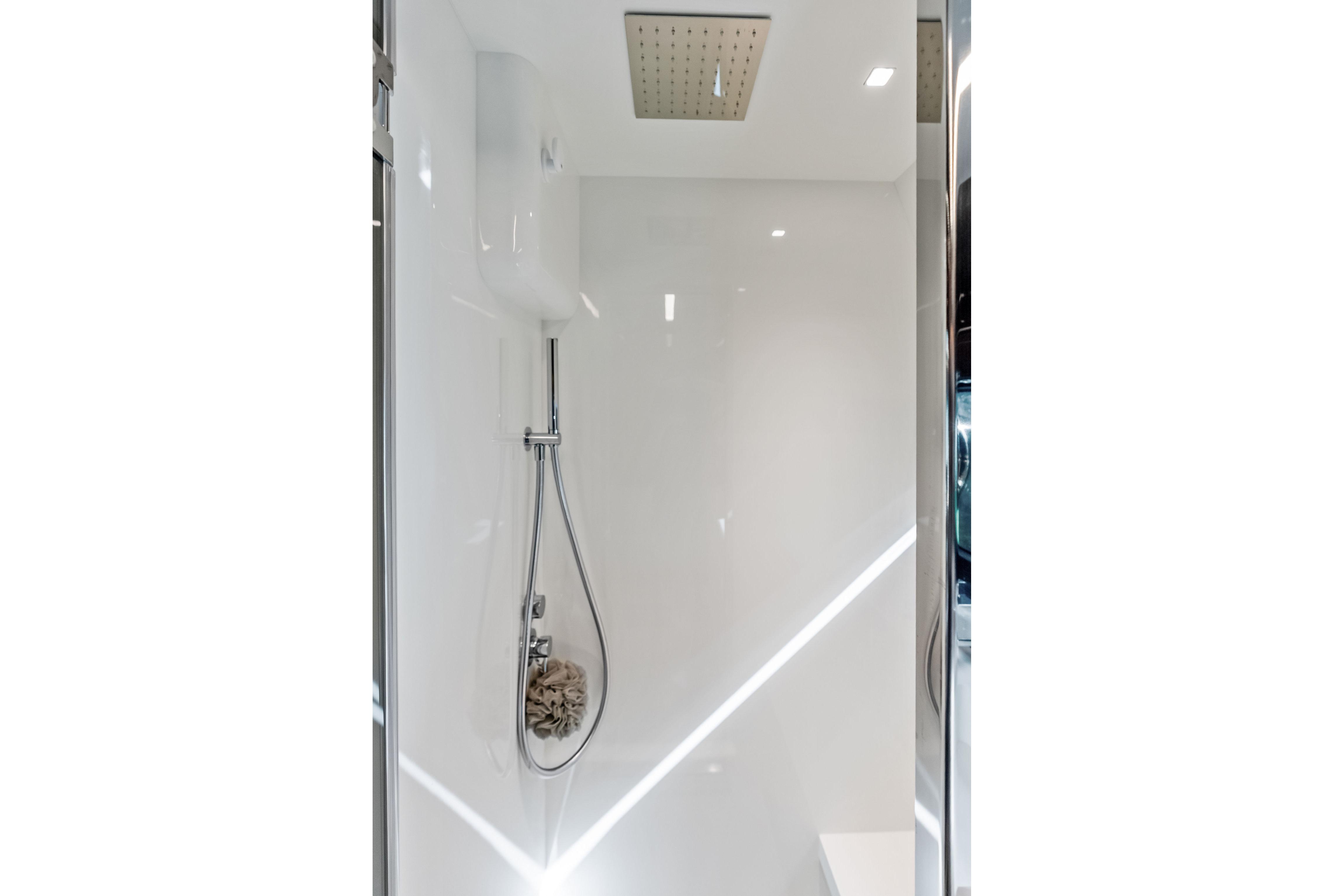Access to the swimming platform via fiberglass steps, floor laid in teak and courtesy lights