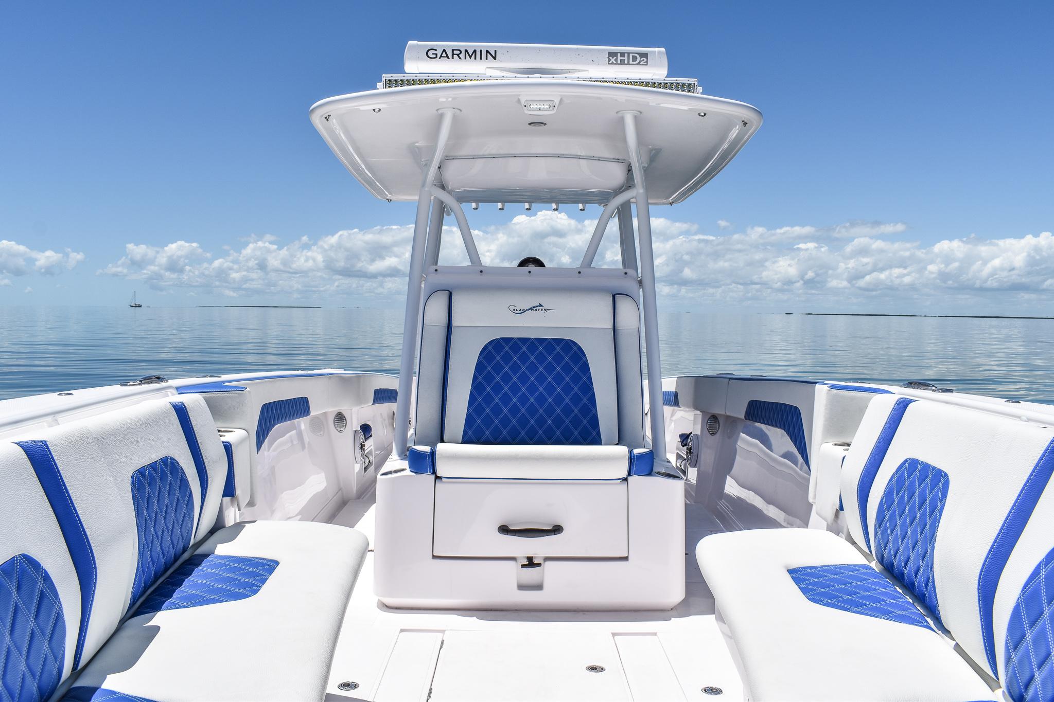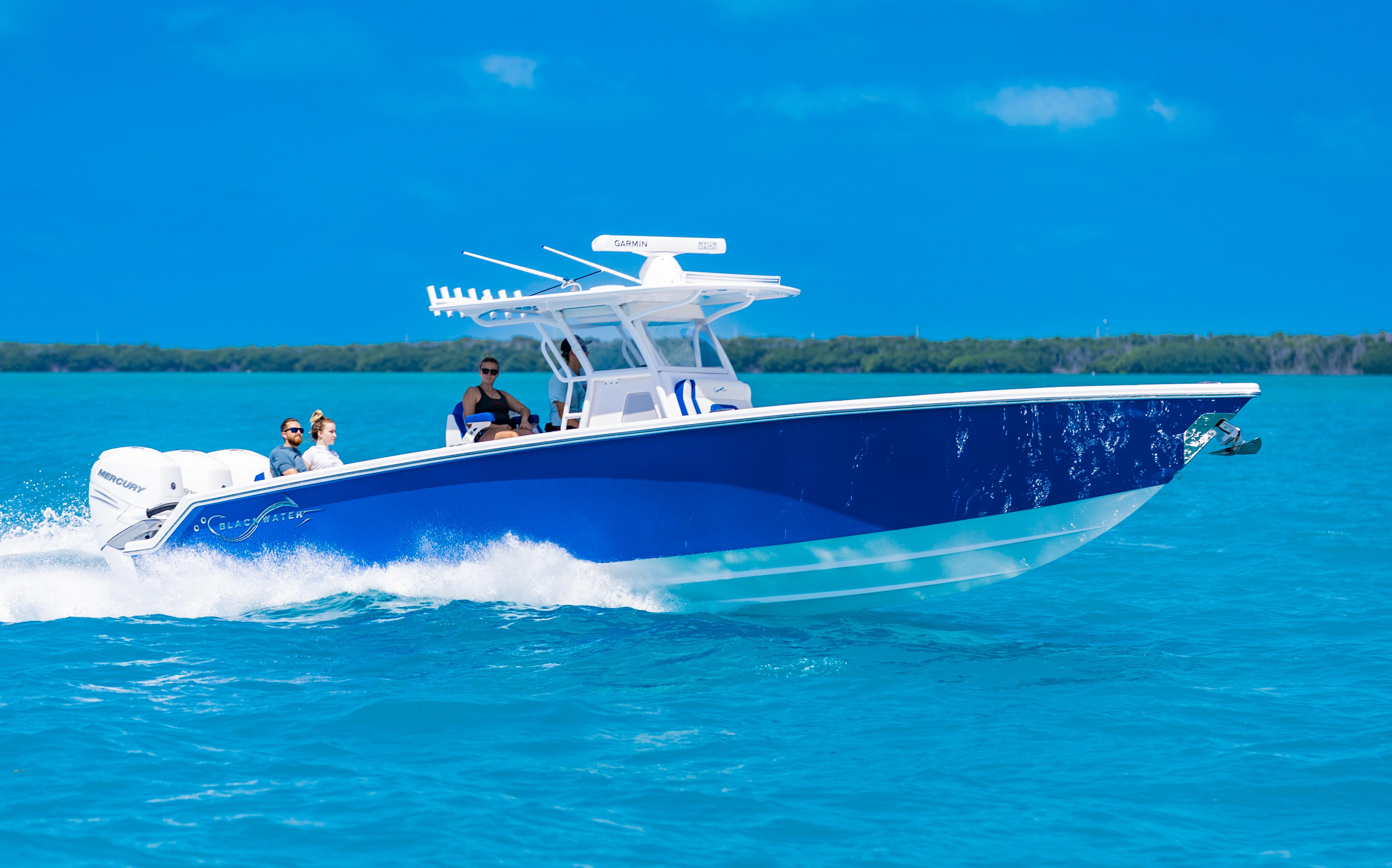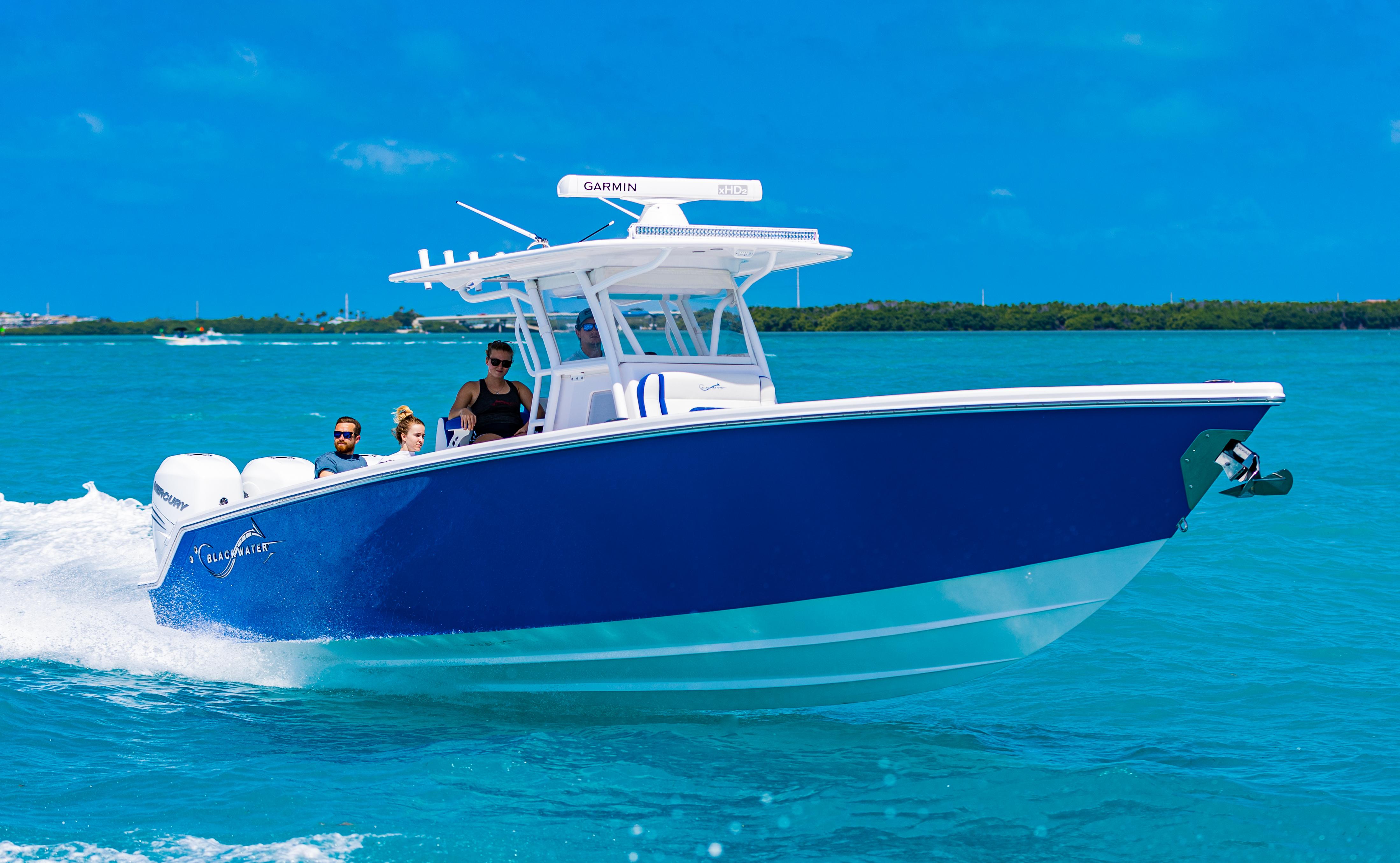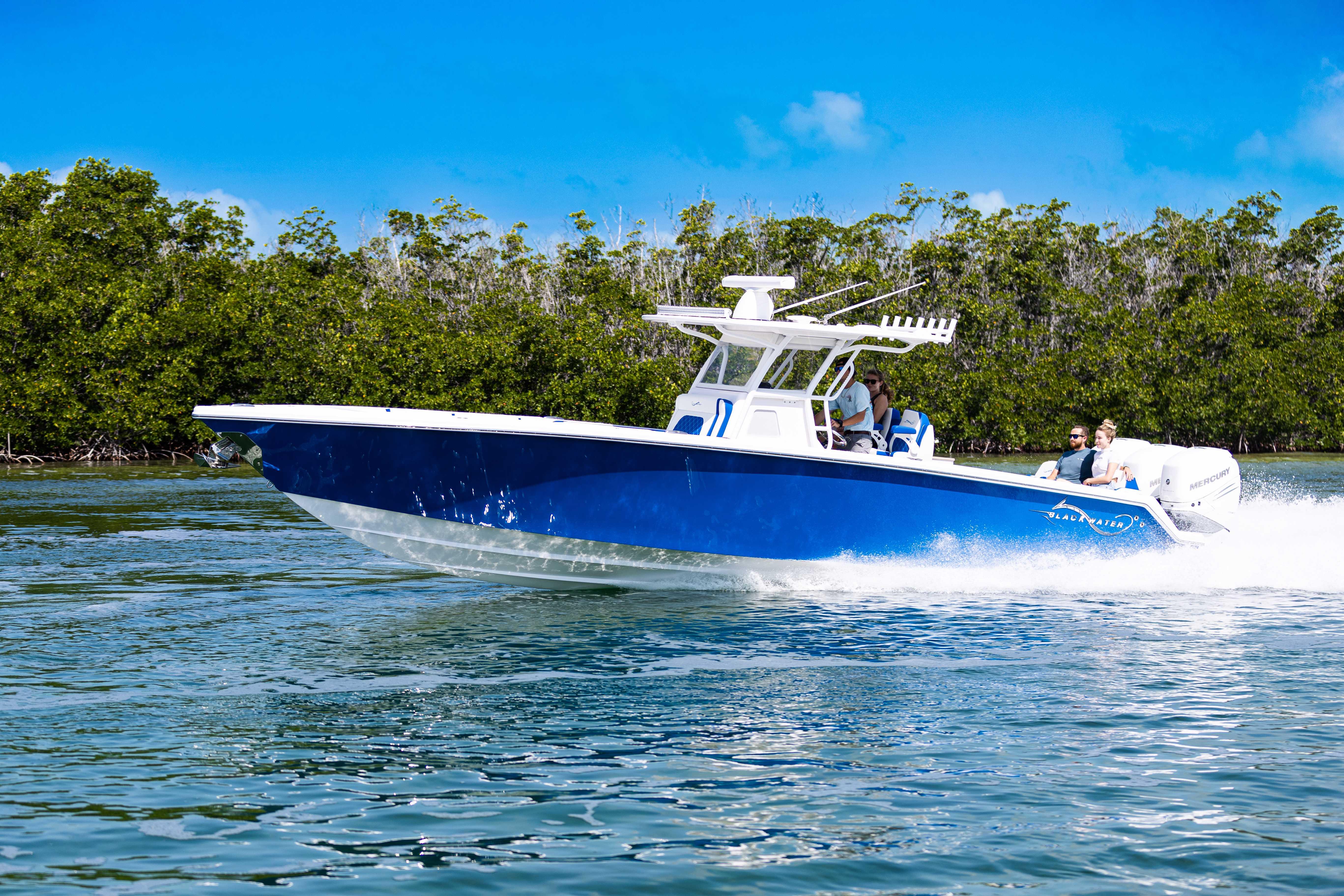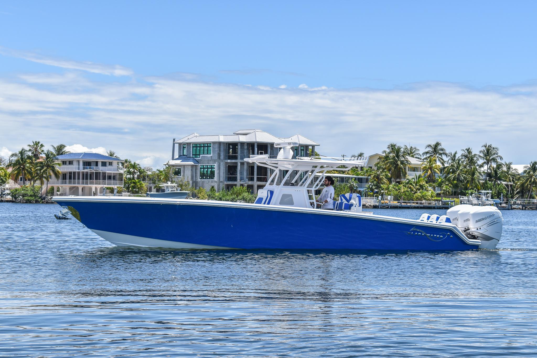 Powered by triple Mercury Verado 400s, this boat features a stunning Lauderdale Blue hull. This Certified Pre-Owned 36' Sport offers speed and sporty handling as well as luxurious details that come standard on any Blackwater build. This boat comes equipped with many desirable upgrades including Autopilot, Garmin Electronics, and an Upgraded JL Audio Sound System. Her low-hours, triple Mercury 400s offer speed while making it an excellent choice for families, fishing trips, or crossing to the Bahamas.