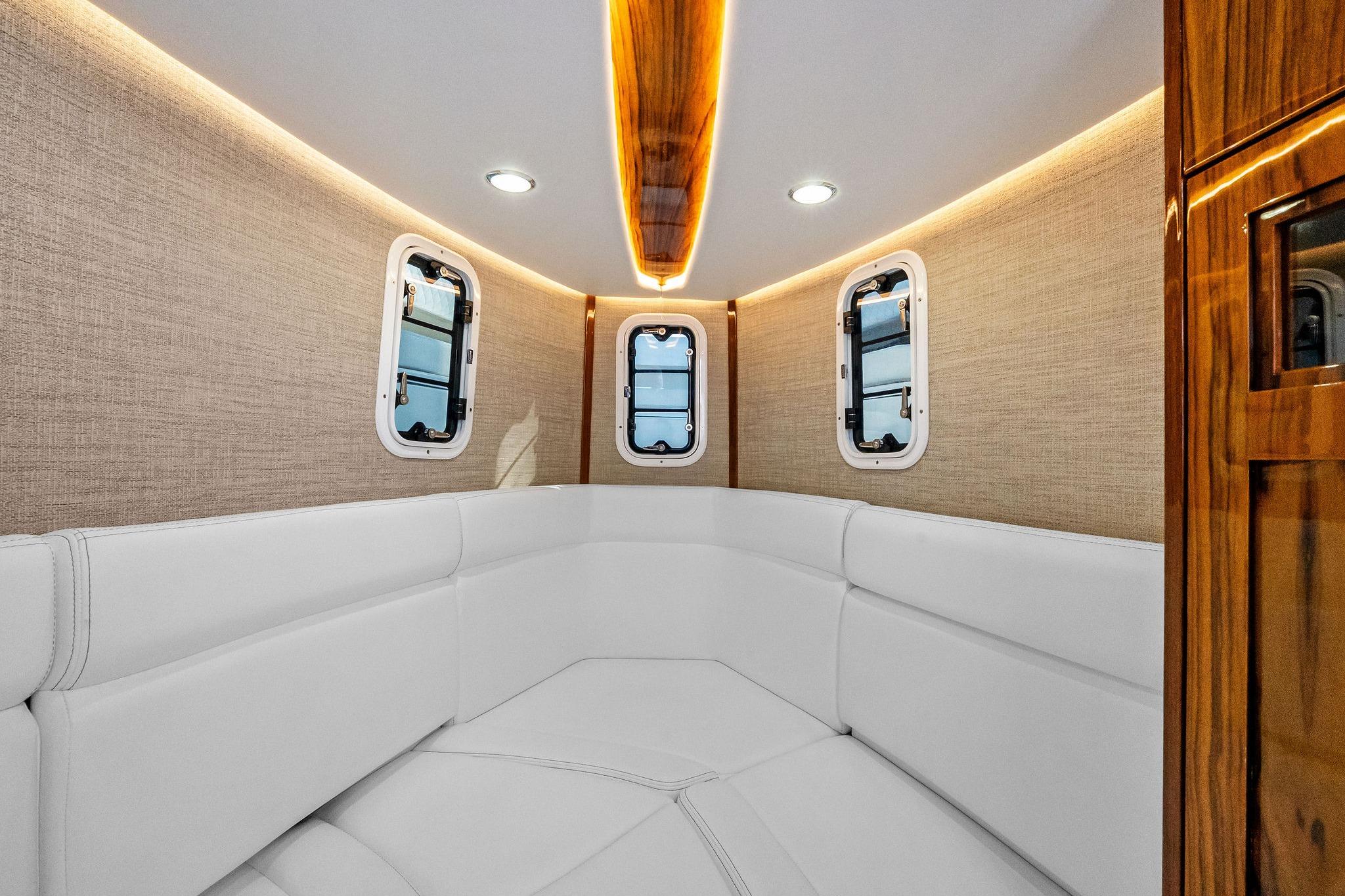 Driven by three Mercury V12 600hp outboards, the Lujo combines exceptional acceleration, efficient cruising, and impressive offshore capability. The newly engineered hull rides with authority and confidence, slicing through waves with minimal bow rise and predictable handling thanks to its thoughtfully designed deadrise and weight distribution. (HCB Yachts)