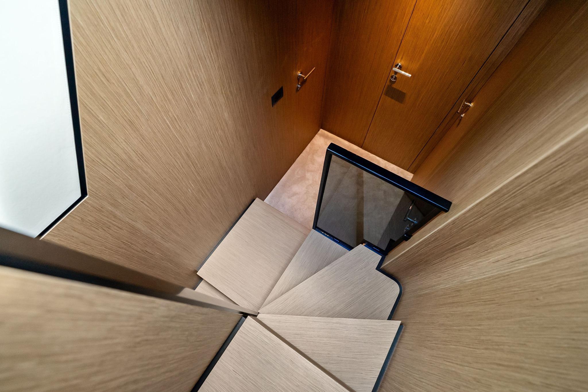 The minimalist yet detailed design provides a continual counterpoint to the walk-in wardrobe and the grand bathroom, where the smoked-glass inserts and functionality of form are in tune with current trends. The winning style of this desirable new model is based on a blend of contrasting textures. The striped ceiling, the ribbed surface of the walls, the grid-pattern headboards and the lounge furniture’s oblique-stripe motif play off one another in a profound natural harmony.
